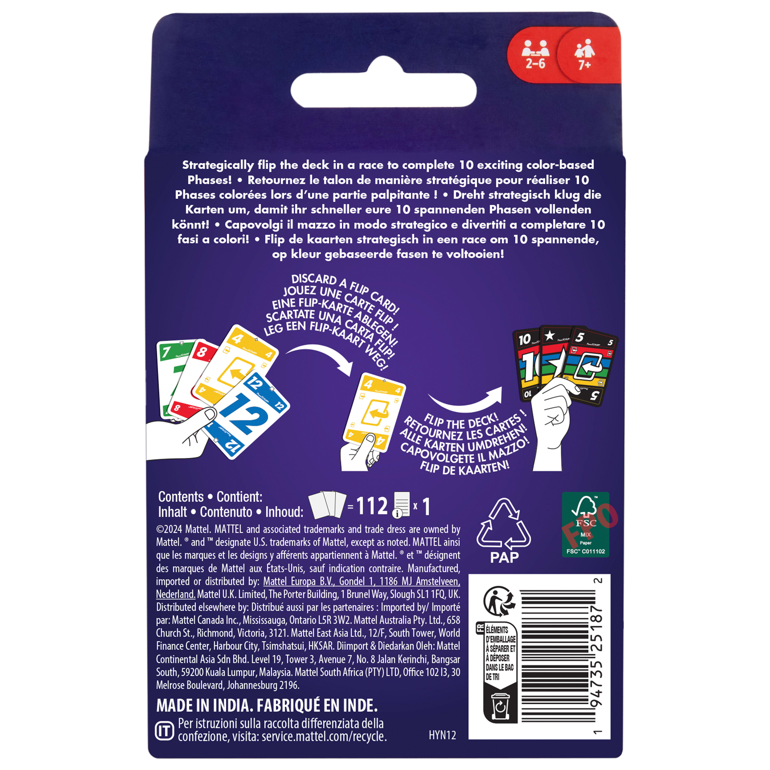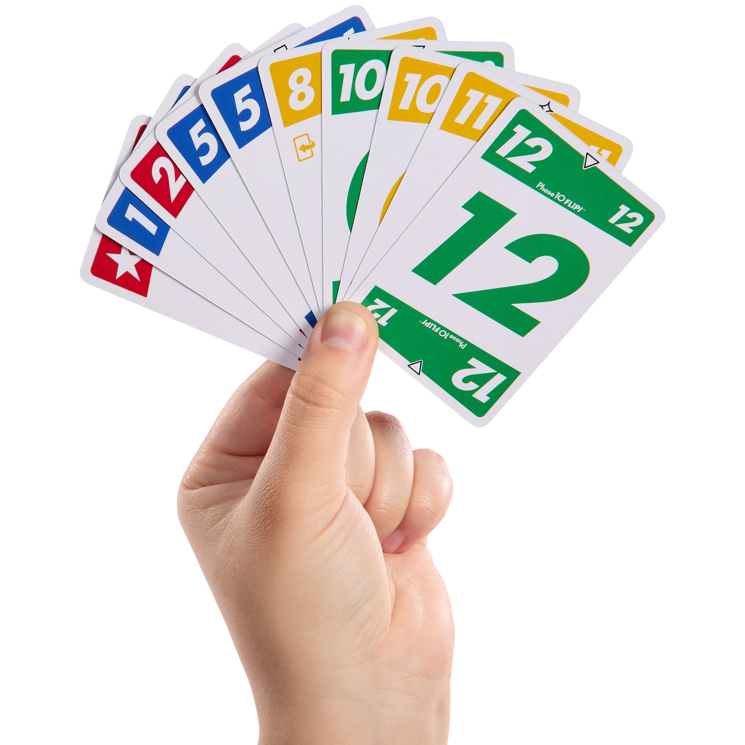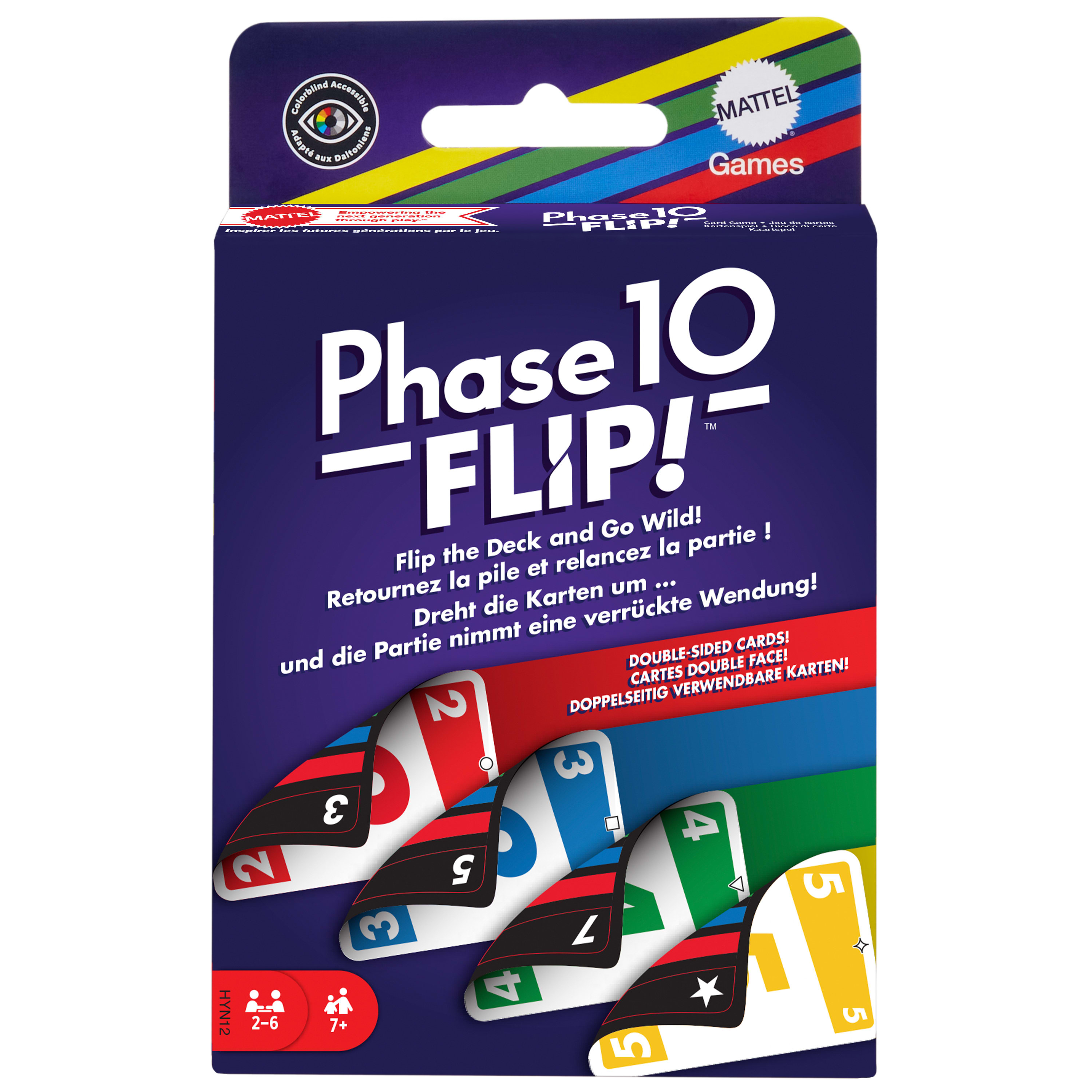 Phase 10 Flip, entwickelt von den Machern des Kartenspiels UNO, stellt den Kartenspielklassiker Phase 10 buchstäblich auf den Kopf! Die Spieler müssen auch hier so schnell wie möglich 10 Phasen abschließen, jedoch warten einige unerwartete Wendungen auf sie die Karten sind zum Beispiel beidseitig bedruckt und es gibt spezielle FLIP-Karten. Auf der einen Seite der Karten sind die gewohnten Farben, die andere Seite der Karten gestaltet sich jedoch KOMPLETT VERRÜCKT! Da es in diesem Spiel darum geht, Folgen in einer Farbe abzuschließen, müssen die Spieler strategisch vorgehen: entweder sie drehen ihre Karten auf die verrückte Seite?, um ihre Phasen schneller abzuschließen, oder sie drehen sie auf die Farbseite zurück, um ihre Gegner aufzuhalten. Dieses lustige Kartenspiel für die ganze Familie ist genau das Richtige für Kinder ab 7 Jahren. Abweichungen in Farbe und Gestaltung vorbehalten.