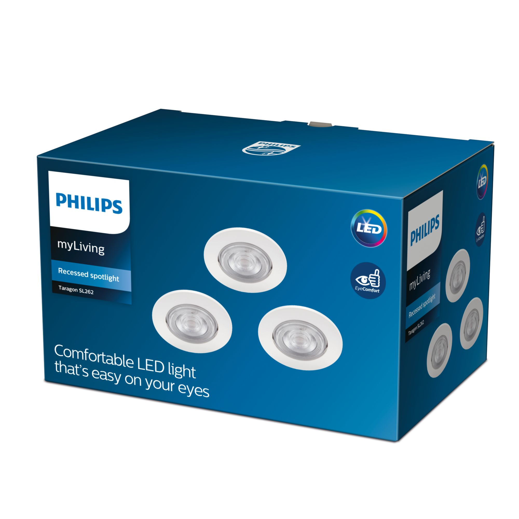 Der Philips Lichtspot Einbaustrahler ist die perfekte Lösung für funktionale Beleuchtung in Innenräumen. Mit seinem modernen Design in Weiß und der energiesparenden LED-Technologie sorgt er für eine angenehme, warmweiße Lichtatmosphäre. Dank der langlebigen Leuchtmittel und des schwenkbaren Spotkopfs bietet er Flexibilität und Effizienz für jeden Raum. Ideal für Deckenmontagen, ist dieser Einbaustrahler ein zuverlässiger Begleiter für stilvolle und praktische Beleuchtung. Features: Energiesparende LED-Technologie für eine nachhaltige Beleuchtung Warmweißes Licht (2700 K) für eine gemütliche Atmosphäre Schwenkbarer Spotkopf für flexible Lichtausrichtung Lange Lebensdauer von bis zu 20.000 Stunden – weniger Wartung erforderlich Kompaktes Design mit einem Durchmesser von 8,5 cm – ideal für Deckenmontagen Lichtleistung von 380 Lumen für eine optimale Helligkeit Strahlungswinkel von 36° für gezielte Beleuchtung Hochwertiges Kunststoffgehäuse für ein robustes und leichtes Produkt Einfache Installation dank einer Ausschnittgröße von 7 cm Internationale Schutzart Ip20 für sicheren Einsatz in Innenräumen Technische Daten: Eingangsspannung: 220-240 V~, 50/60 Hz Produkt enthält eine Lichtquelle der Energieeffizienzklasse F (EEK-Spektrum A – G) Lampenleistung: 4,5 W Lichtleistung: 380 Lumen Farbtemperatur: 2700 K Lichtfarbe: Warmweiß Strahlungswinkel: 36° Produkttyp: Einbaustrahler Produktfarbe: Weiß Für die Nutzung im Innenbereich geeignet: Ja Deckenform: Rund Empfohlene Platzierung: Funktional Gehäusematerial: Kunststoff Internationale Schutzart (IP-Code): Ip20 Schutzart: II Leuchtmitteltyp: LED Leuchtmittel enthalten: Ja Fassungs-/Sockeltyp: Nicht austauschbare(s) Leuchtmittel Lampentechnologie: LED Leuchtmittellebensdauer: 20000 Stunden Farbwiedergabeindex (Cri): 80 Ra Dimmbar: Nein Schwenkbarer Spotkopf: Ja Höhe: 42 mm Durchmesser: 85 mm Ausschnitt Ø: 70 mm Einbautiefe: 50 mm Wandstärke: max. 15 mm Lieferumfang: 3x Einbauleuchte 1x Anleitung