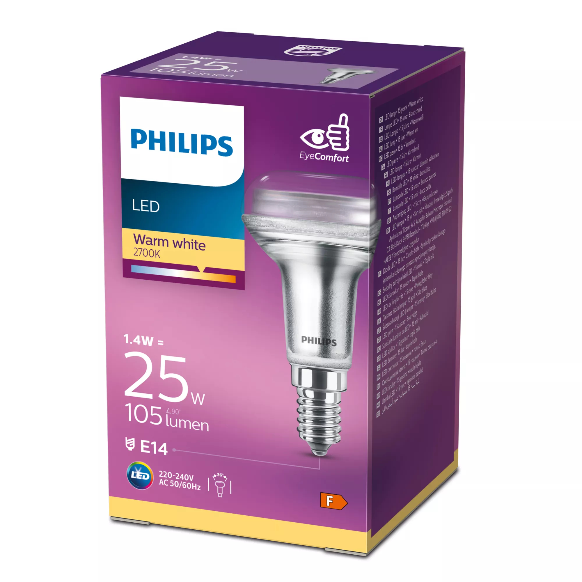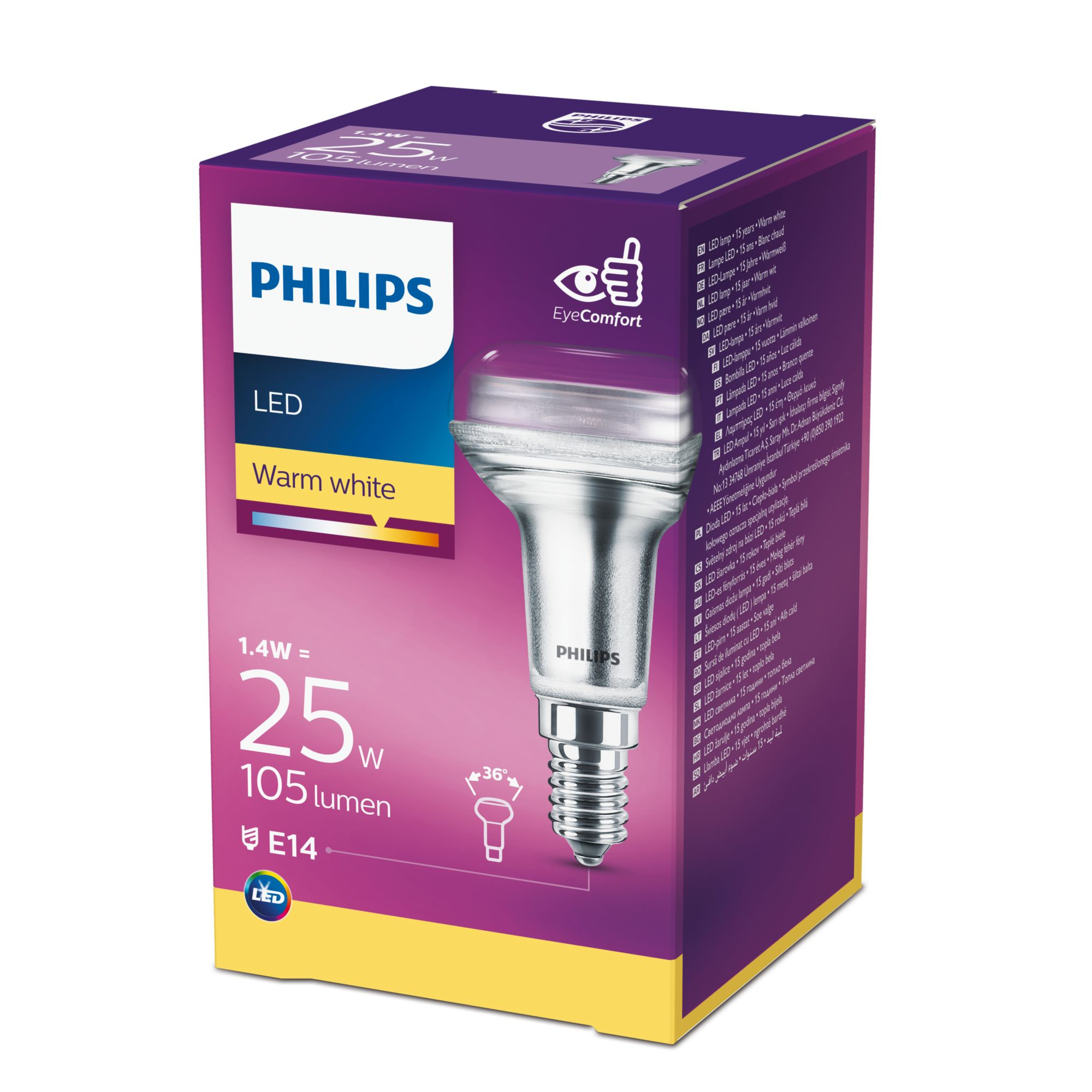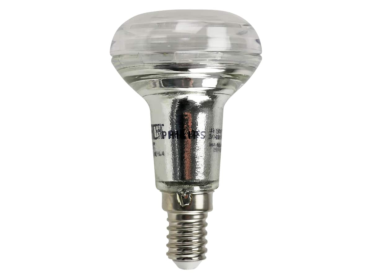 Erleben Sie langlebige und energieeffiziente Beleuchtung mit der Philips LED-Lampe. Diese Reflektorlampe bietet ein warmweißes Licht mit einer Farbtemperatur von 2700 K, ideal für gemütliche Wohnräume. Mit einer Lebensdauer von bis zu 15.000 Stunden und einem gerichteten Lichtstrahl sorgt sie für eine optimale Ausleuchtung. Perfekt als Ersatz für herkömmliche Reflektorlampen und dabei äußerst stromsparend. Features: Langlebige LED-Technologie mit einer Lebensdauer von bis zu 15.000 Stunden – weniger häufige Lampenwechsel nötig Warmweißes Licht (2700 K) für eine angenehme und gemütliche Atmosphäre Direktionales Licht mit einem Strahlungswinkel von 36° für gezielte Beleuchtung Hohe Beleuchtungseffizienz von 75 lm/W – spart Energie und senkt Stromkosten E14-Sockel für einfache Installation in Standardfassungen Sofort volle Lichtleistung ohne Aufwärmzeit – ideal für Räume, die direkt beleuchtet werden müssen Quecksilberfreies Design – umweltfreundlich und sicher Klarer Glasreflektor für eine elegante Optik und optimale Lichtverteilung Kompatibel für den Innenbereich – perfekt für Wohnräume, Büros oder Akzentbeleuchtung Hohe Farbtreue mit einem Farbwiedergabeindex (Cri) von 80 für natürliche Farbwahrnehmung Technische Daten: Energieeffizienzklasse: F EEK-Spektrum: A – G Gewichteter Energieverbrauch: 2 kWh/1000 h Eingangsspannung: 220 - 240 V Eingangsfrequenz: 50 - 60 Hz Lampenleistung: 1,4 W Fassungs-/Sockeltyp: E14 Glühlampenform: Reflektor Lichtleistung: 105 lm Leuchtmittellebensdauer: 15000 h Äquivalente Glühlampenleistung: 25 W Lichtfarbe: Warmweiß Farbtemperatur: 2700 K Dimmbar: Nein Strahlungswinkel: 36° Farbwiedergabeindex (Cri): 80 Ra Leistungsfaktor: 0,5 Anzahl der Schaltzyklen: 50000 Lichtstromstabilitätsfaktor: 70% Lichtausbeute: 75 lm/W Aufwärmzeit bis zu 60 % Licht: 0,5 s Gewicht: 60 g Material: Glas Quecksilbergehalt: 0 mg Bemessungsleistung: 1,4 W Einschaltzeit: 0,1 s Glastyp: klar Glasfarbe: Transparent Maße (LxBxH): 50x50x84 mm