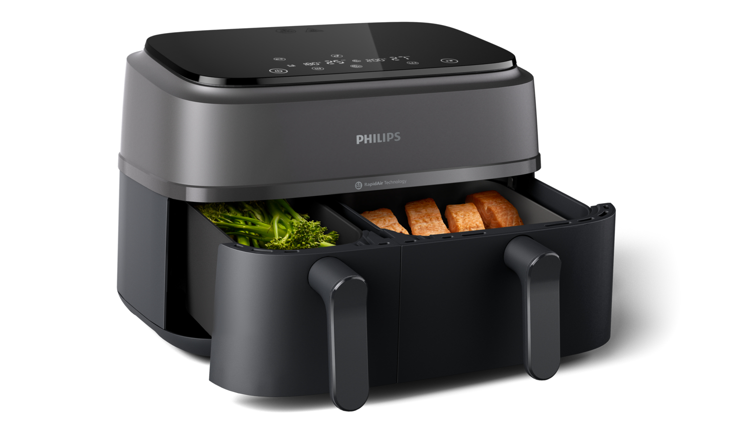Mit nur einem Tastendruck kannst du die Garzeiten in den Körben so abstimmen, dass die Speisen auf beiden Seiten gleichzeitig fertig sind und zusammen serviert werden können – frisch, heiß und lecker.