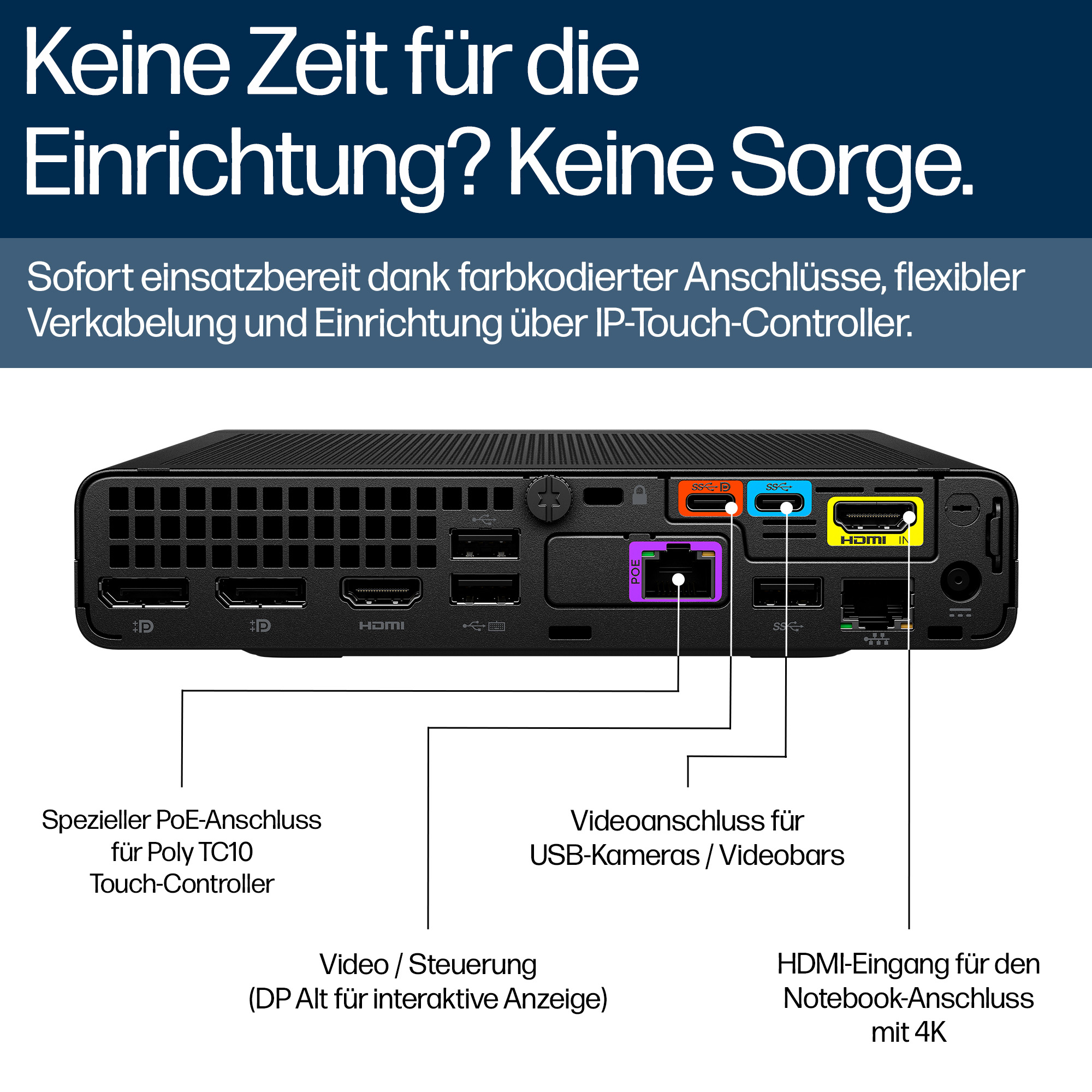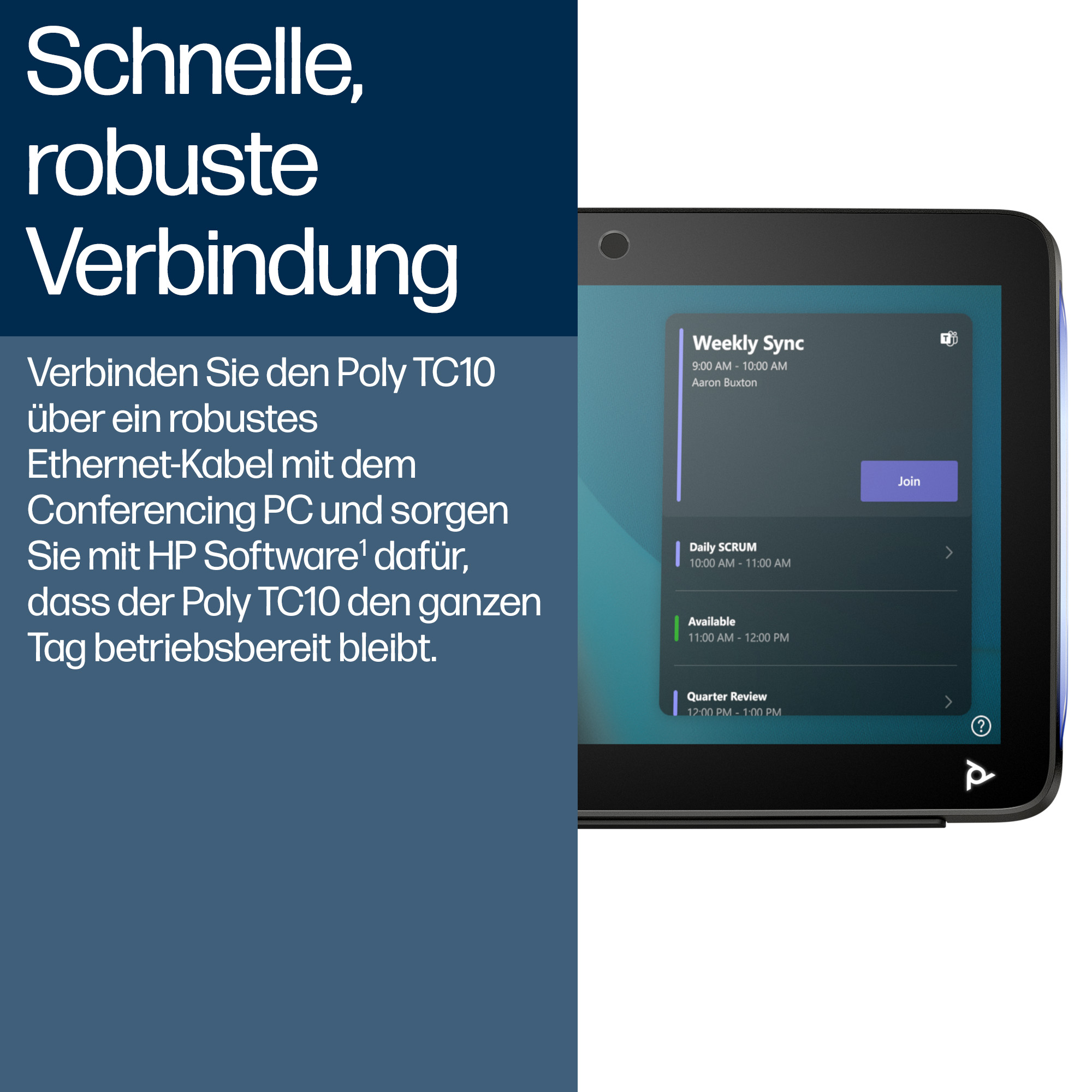 Verlassen Sie sich darauf, dass der Poly TC10 Touch-Controller Ihre Microsoft Teams Besprechung von überall im Raum bewältigt. Verbinden Sie ihn einfach über ein flexibles Ethernet-Kabel mit dem HP Mini Konferenz-PC. Die HP Software hilft Ihnen sicherzustellen, dass er den ganzen Tag stabil läuft[2, 3].