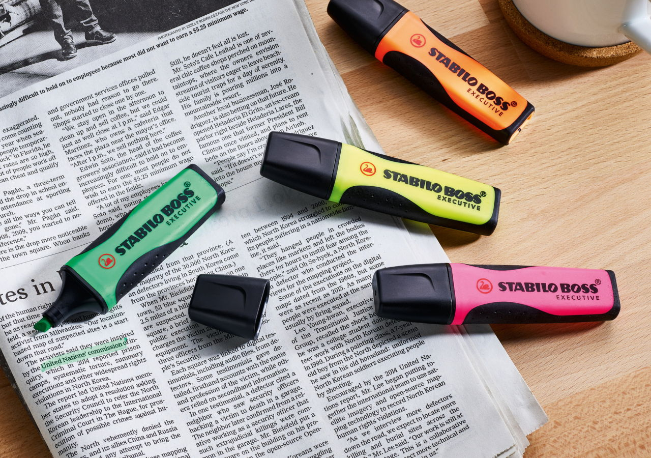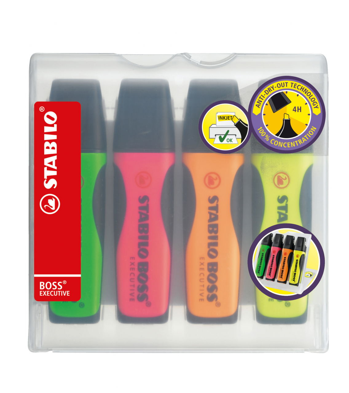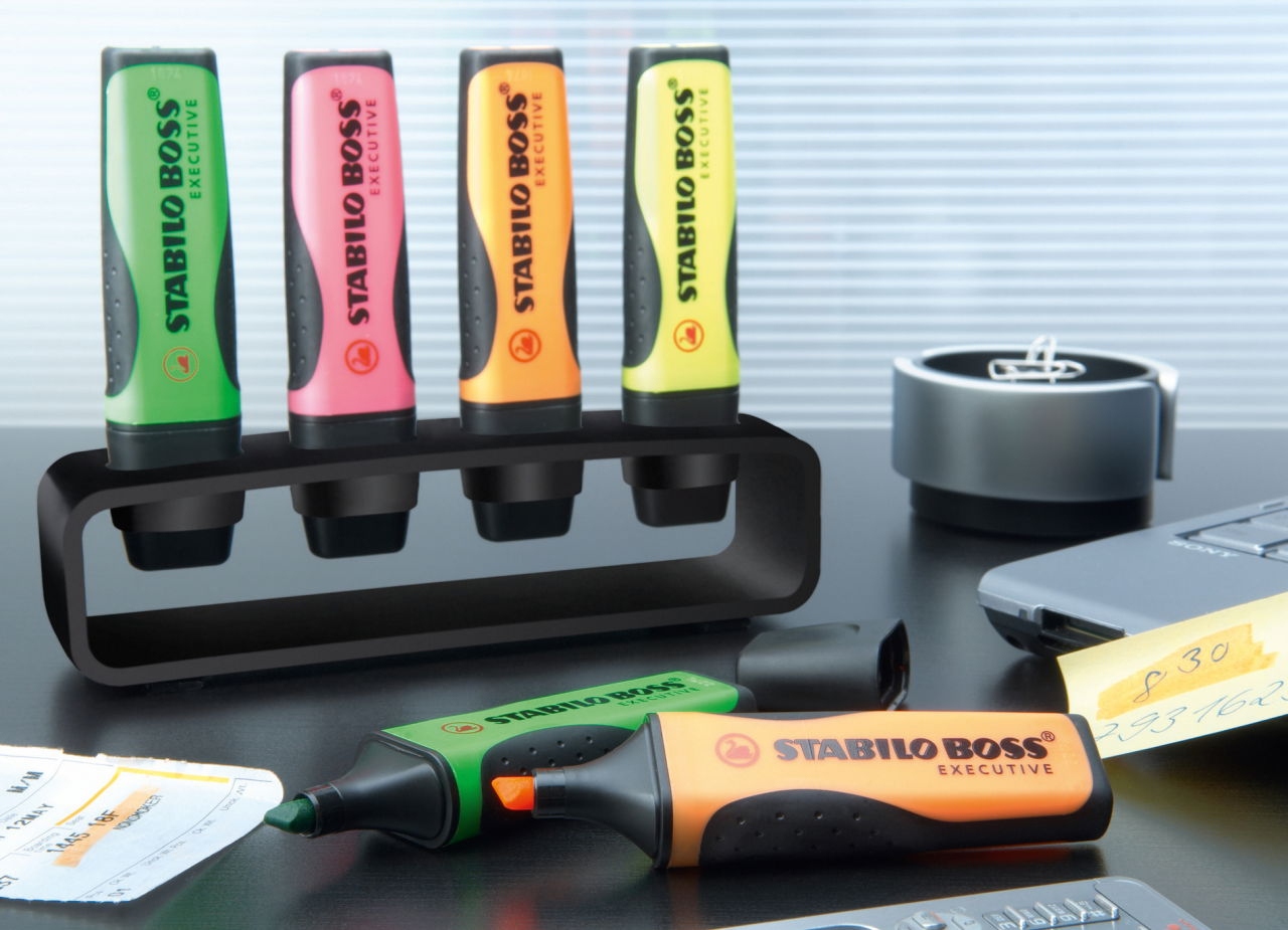 Merkmale:STABILO BOSS EXECUTIVE. Premium-Textmarker für alle, die besonders viele Texte lesen. STABILO Anti-Dry-Out Technology: 4 Stunden Austrocknungsschutz für konzentriertes Arbeiten. Klassische Form mit weicher ergonomischer Griffzone. Patentierte Anti-Schmier-Tinte für Kopien, Tintenstrahl-Ausdrucke oder Handgeschriebenes. Empfohlen von führenden Druckerherstellern. Tinte auf Wasserbasis. 2 Strichstärken 2 + 5 mm.