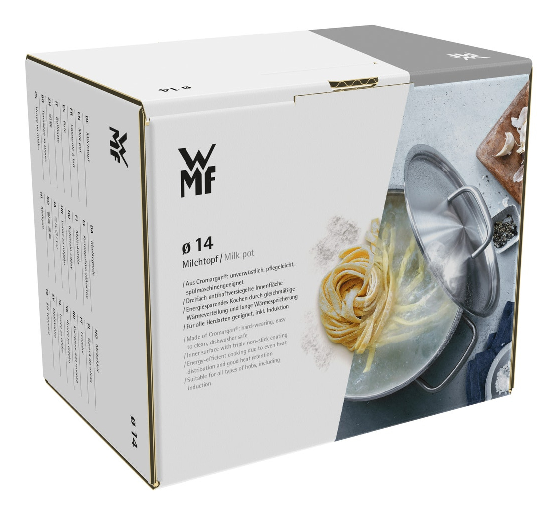 Französische Eleganz für jede Küche Die moderne und markante Formgebung des Provence Plus Milchtopfs mit 14 cm Durchmesser von WMF bringt mehr als nur einen Hauch südfranzösischer Eleganz in jede Küche und begeistert dazu mit dem energiesparenden TransTherm®-Allherdboden sowie hoher Langlebigkeit. Gefertig aus poliertem Cromargan®: Edelstahl Rostfrei 18/10 darf der praktische Milchtopf natürlich zur bequemen Reinigung in die Spülmaschine.