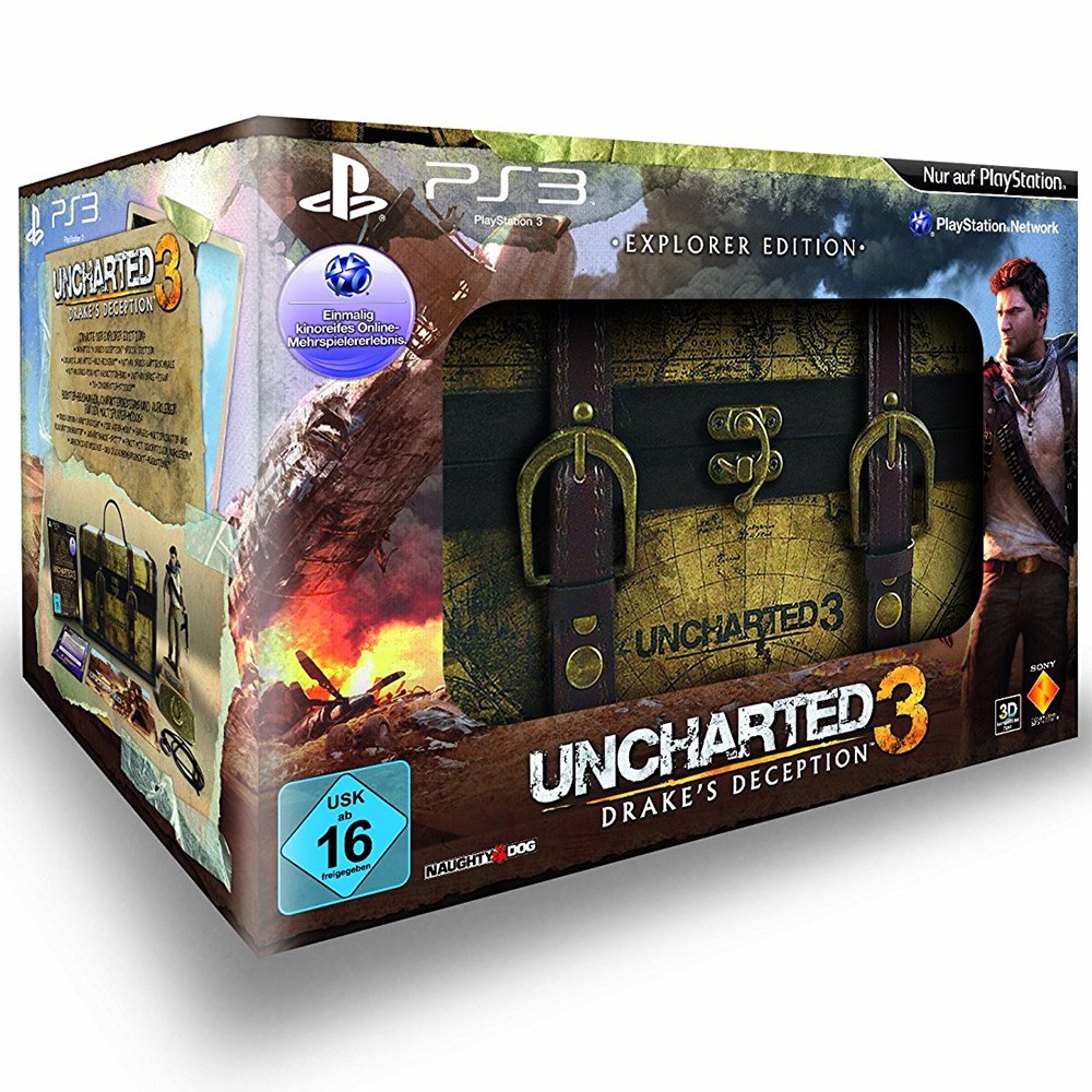 Dieser Artikel ist vorbestellbar und erscheint am 02.11.2011EXPLORER EDITION Exklusive, antik anmutende Holz-Reisebox für jeden Sammler ein Muss! + Special Edition + Nathan-Drake-Figur + Nathan Drakes Ring mit Halskettenband + Nathan Drakes Gürtelschnalle + 3D-Linsenraster-Sticker + alle DLCs & Vorbestellerboni. Die Handlung von Uncharted 3: Drakes Deception folgt Glücksritter Nathan Drake durch eine packende, action-gefüllte Story über den ganzen Globus. Drake und sein langjähriger Freund Victor Sullivan brechen auf ihrer Suche nach dem Atlantis des Sandes auf eine Reise in das Herz der arabischen Wüste auf. Als die schrecklichen Geheimnisse dieser verlorenen Stadt aber ans Licht kommen, wird ihre Reise zu einem verzweifelten Kampf ums Überleben, der sie zwingt, ihre tiefsten Ängste zu konfrontieren.FEATURES:- Überzeugendes Storytelling, actionreiches Gameplay, flüssigere Animationen dank Motion Capturing und 3D-Unterstützung. Uncharted 3 ist ein interaktives Erlebnis, das die Grenzen zwischen Spielen und Hollywood-Blockbustern verschwimmen lässt.- Eine neue Weltreise zwischen Realität und Fiktion auf den Spuren der Vergangenheit - und auf denen des historischen Arabienforschers T. E. Lawrence oder auch Lawrence von Arabien- Protagonist Nathan Drake: ein humorvoller, charismatischer, schlagfertiger und verlässlicher Hauptcharakter, der sich erfolgreich etabliert hat!- Das Uncharted-Universum präsentiert ein einzigartiges Multiplayer-Erlebnis, in dem zum ersten Mal filmische Elemente der Einzelspielerkampagne in das Multiplayer-Gameplay integriert sind.