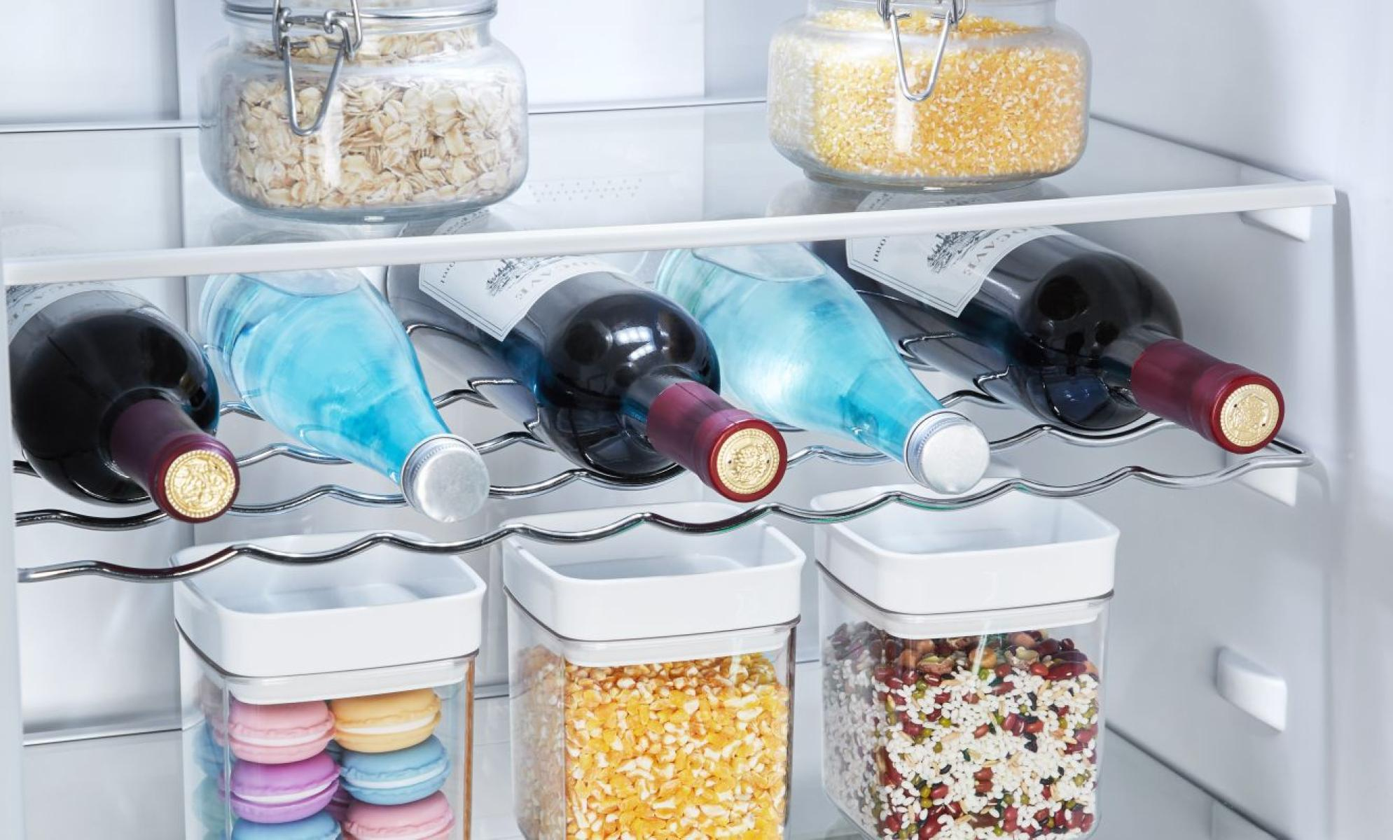 Ein stilvolles Regal für Weinflaschen und Erfrischungsgetränke, das mehr Platz im Rest des Kühlschranks lässt. Nun rollen keine Flaschen mehr in den Kühlschrankregalen herum.