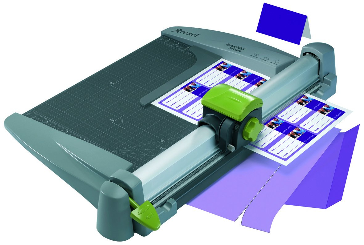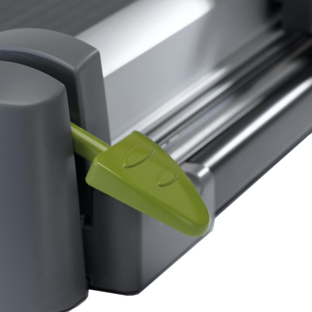 Rollenschneider mit auswechselbarem Messerkopf.; Manuelle Pressung.; 3 Schnittstile in einem Gerät: gerader Schnitt, Perforation und Falzung.; Langlebiger, robuster Metalltisch.; Lineal mit cm- und inch-Einteilung.; Geschütztes Messer im geschlossenen Kunststoffknopf.; Schneidet auch Laminate bis zu 250 Micron Folienstärke.; Gewicht: 3,4 kg.; Farbe: Silber/Anthrazit.; Tischgröße: 615 x 410 mm (B x T).; Schnittlänge: 387 mm.; Schneidleistung: 3 mm, 30 Blatt (80 g/qm).; GS-Zeichen TÜV Rheinland.;