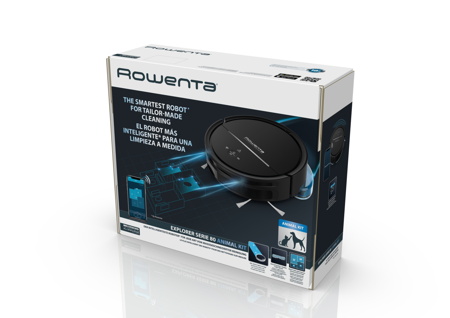 Eine Kombination aus fortschrittlicher Technologie und benutzerfreundlicher Steuerung. Der Rowenta EXPLORER 80 Saugroboter bietet eine professionelle Reinigungserfahrung, um Ihr gesamtes Zuhause praktisch zu säubern. Entdecken Sie einen automatischen Saugroboter, der überall hinkommt, mit einer hochpräzisen Navigation und benutzerdefinierten Einstellungen. Sparen Sie dank dieser praktischen, benutzerdefinierten Erfahrung Zeit. Fortschrittliche Technologie plus Performance: das Aqua Force System wischt den Boden, wobei gleichzeitig Staub gesaugt wird. Die Animal Turbo-Düse macht Schluss mit Tierhaaren und Schmutz von Haustieren und das ist noch lange nicht alles. Entdecken Sie eine zuverlässige intensive, mühelose Saugerfahrung mit der Rowenta Saugroboter-App (für iOS und Android), inklusive Sprachassistent-Kompatibilität (Google Assistant, Amazons Alexa) und einer automatischen WLAN-Konnektivität.