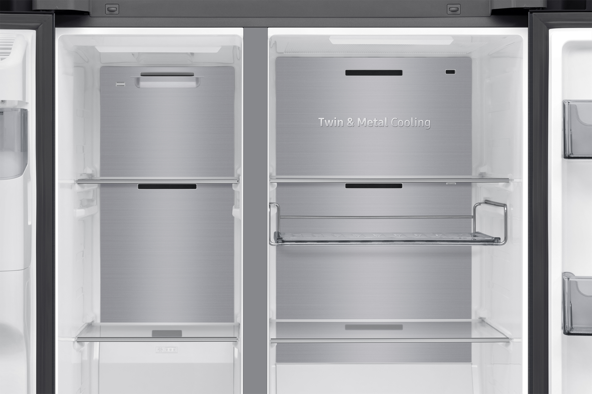 Metal Cooling behält die passende Temperatur im Kühlschrank, damit Lebensmittel auch bei häufigem Türöffnen frisch bleiben. So können Temperaturschwankungen im Innenraum reduziert werden und Lebensmittel frisch bleiben. Metal Cooling ist leicht zu reinigen verleiht dem Kühlschrank einen Profi-Look.
