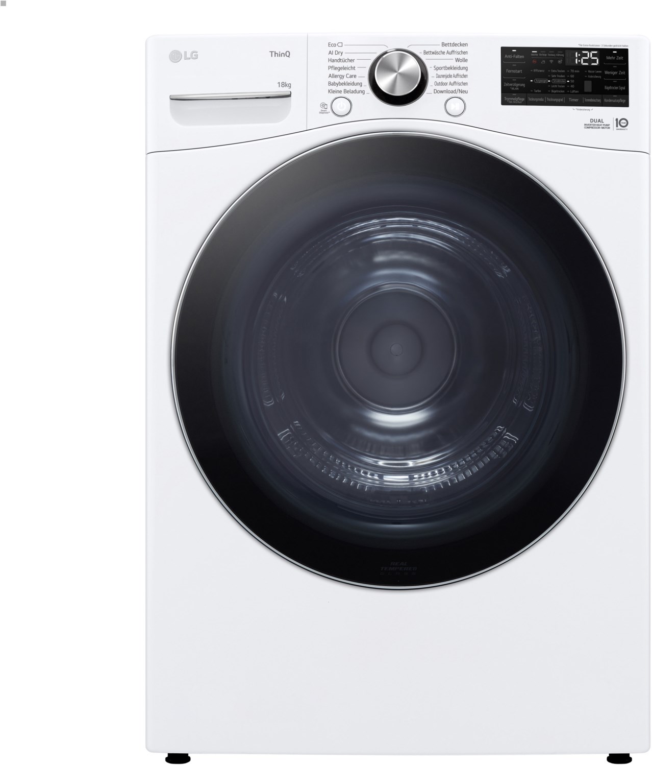 Trockner RT18VT von LG Das Modell RT18VT ist ein Wärmepumpentrockner von LG. Mit einer Geräuschemission von 63 dB arbeitet der LG RT18VT ausgesprochen leise. Mit einem Fassungsvermögen von 18 kg eignet sich das Gerät für Haushalte ab 5 Personen. Auf das richtige Programm kommt es an Muss es schnell gehen, profitieren Sie vom Kurz-Programm und vom Mini-Programm. Sehr empfehlenswert ist das Allergiker-Programm, da Keime und Allergene hier keine Chance haben . Für Wolle, Bettwäsche, Outdoor- und Sportbekleidung, große Wäschestücke, Koch- und Buntwäsche, Handtücher sowie Pflegeleichtes besitzt das Gerät jeweils eigene Programme. Das Baby-Programm und das Extra-Trocken-Programm sind ebenso Optionen des LG RT18VT. Flusen nach Programmende zu entfernen ist dank automatischer Flusenentfernung im Kondensator nicht erforderlich. Weitere Eigenschaften des Wärmepumpentrockners Der Tür-Anschlag lässt sich links oder rechts anbringen. Die Kindersicherung verhindert unliebsame Überraschungen. Die Restzeit und andere hilfreiche Infos werden auf dem Display angezeigt. Das Modell trägt die Energieeffizienzklasse D und ist mit der Kondensationseffizienzklasse B ausgezeichnet. Unsere Kaufempfehlung Die richtige Wahl ist der LG RT18VT für alle, die sich einen Wärmepumpentrockner mit Selbstreinigung und Kindersicherung wünschen.