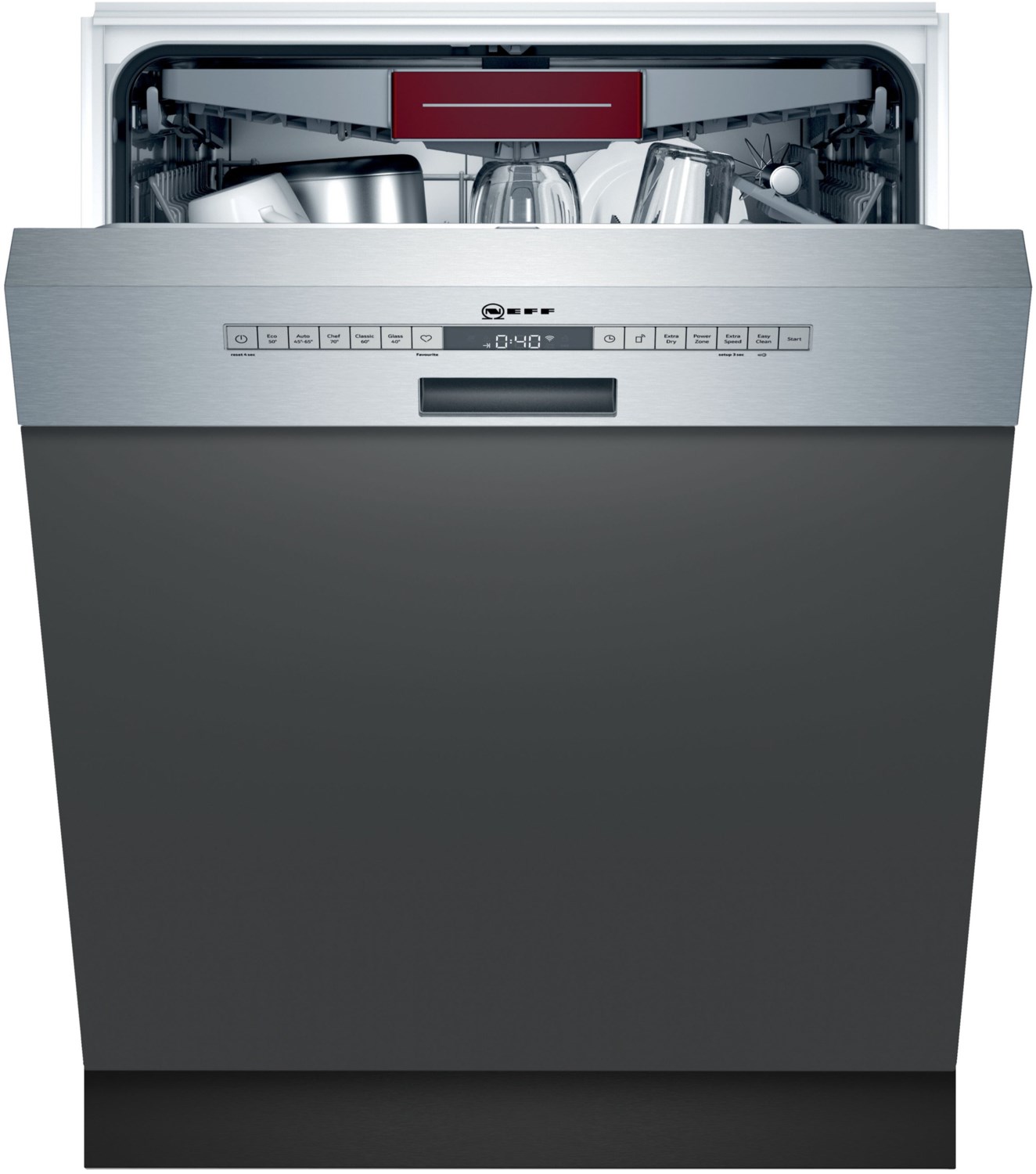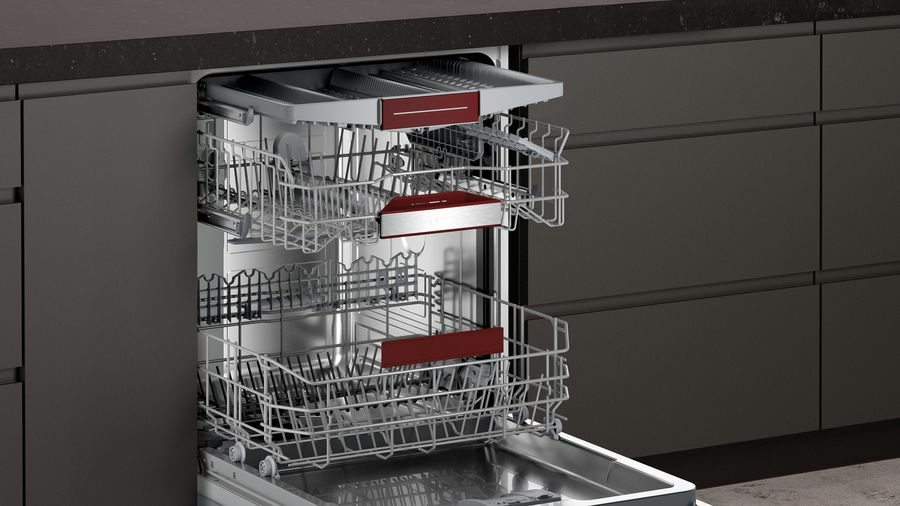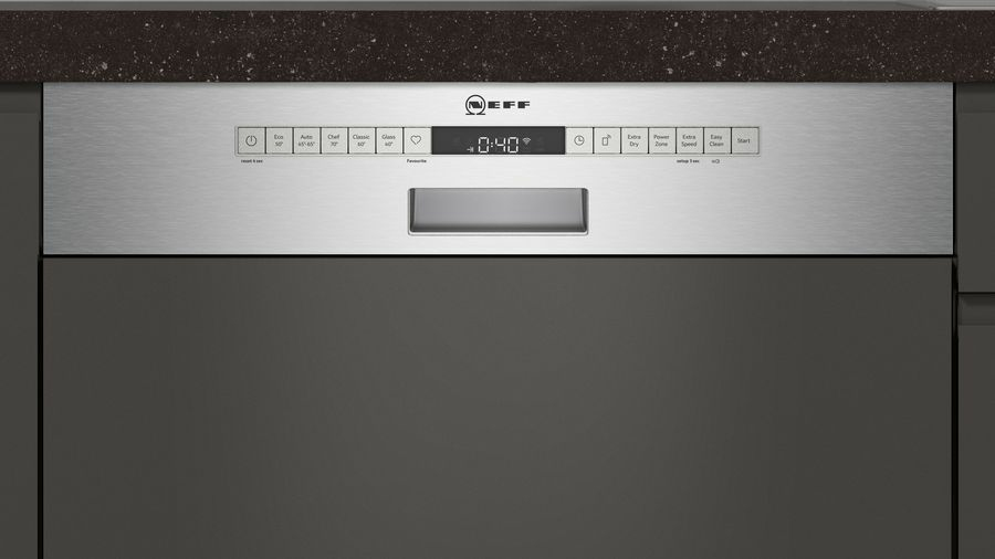 Spülmaschine NEFF S145ECS05E Das Modell S145ECS05E ist ein Einbau-Geschirrspüler (60 cm) von NEFF. Mit einer Kapazität von 13 Standardgedecken eignet sich das höhenverstellbare Gerät für Familien. Programme und Funktionen Insgesamt stellt die Spülmaschine 6 Programme bereit. Sparen Sie Ressourcen und somit Kosten mit den Energiespar-Programmen. Muss es fix gehen, dann profitieren Sie vom Kurz-Programm. Stark verschmutztes Geschirr, das eine intensivere Reinigung nötig hat, erhält diese mit dem Intensiv-Programm. Für gleichbleibend sauberes Geschirr benötigt auch die Spülmaschine hin und wieder eine Reinigung, die die NEFF S145ECS05E mit dem eigens hierfür vorgesehenen Programm ganz von alleine durchführt. Das Gläser-Programm und das Vorspül-Programm sind ebenso Optionen der NEFF S145ECS05E. Das geeignetste Programm für Ihre Teller, Tassen und Töpfe nutzen Sie mit dem Automatik-Programm. Der Wasserverbrauch passt sich automatisch an. Von 40 bis 70 Grad reichen die Temperaturen in den Programmen. Der Geschirrspüler verfügt zudem über folgende Eigenschaften Der klappbare Tellereinsatz, die Besteckschublade und 4 Tassenauflagen bieten den Tellern, dem Besteck und den Tassen den richtigen Platz, denn räumen Sie richtig ein, ist das Geschirr schon halb gespült. Besonders praktisch ist die Höhenverstellbarkeit des Oberkorbs, er lässt sich sogar in beladenem Zustand nach oben oder unten bewegen. Grauschleier ade, die eingebaute Wasserenthärtung hält die Gläser klar. Sie wünschen sich einen Geschirrspüler, der so flexibel ist wie Sie? In diesem Fall ist das Feature Startzeitvorwahl erwähnenswert. Hilfreiche Infos wie die Restzeit des aktuellen Durchlaufs werden Ihnen auf dem Display angezeigt. Um jedes Mal top Ergebnisse zu erreichen, ist die NEFF S145ECS05E mit einer elektrischen Salz-Nachfüllanzeige und mit einer elektrischen Klarspüler-Nachfüllanzeige ausgerüstet. Im Hinblick auf die Effizienz ist die Energieeffizienzklasse C zu erwähnen. Die Kindersicherung und der Wasser-Stopp verhindern böse Überraschungen. Unsere Kaufempfehlung Wie geschaffen ist die NEFF S145ECS05E für alle, die sich einen Einbau-Geschirrspüler mit Selbstreinigung, Kindersicherung sowie Wasser-Sicherung und Besteckschublade wünschen.