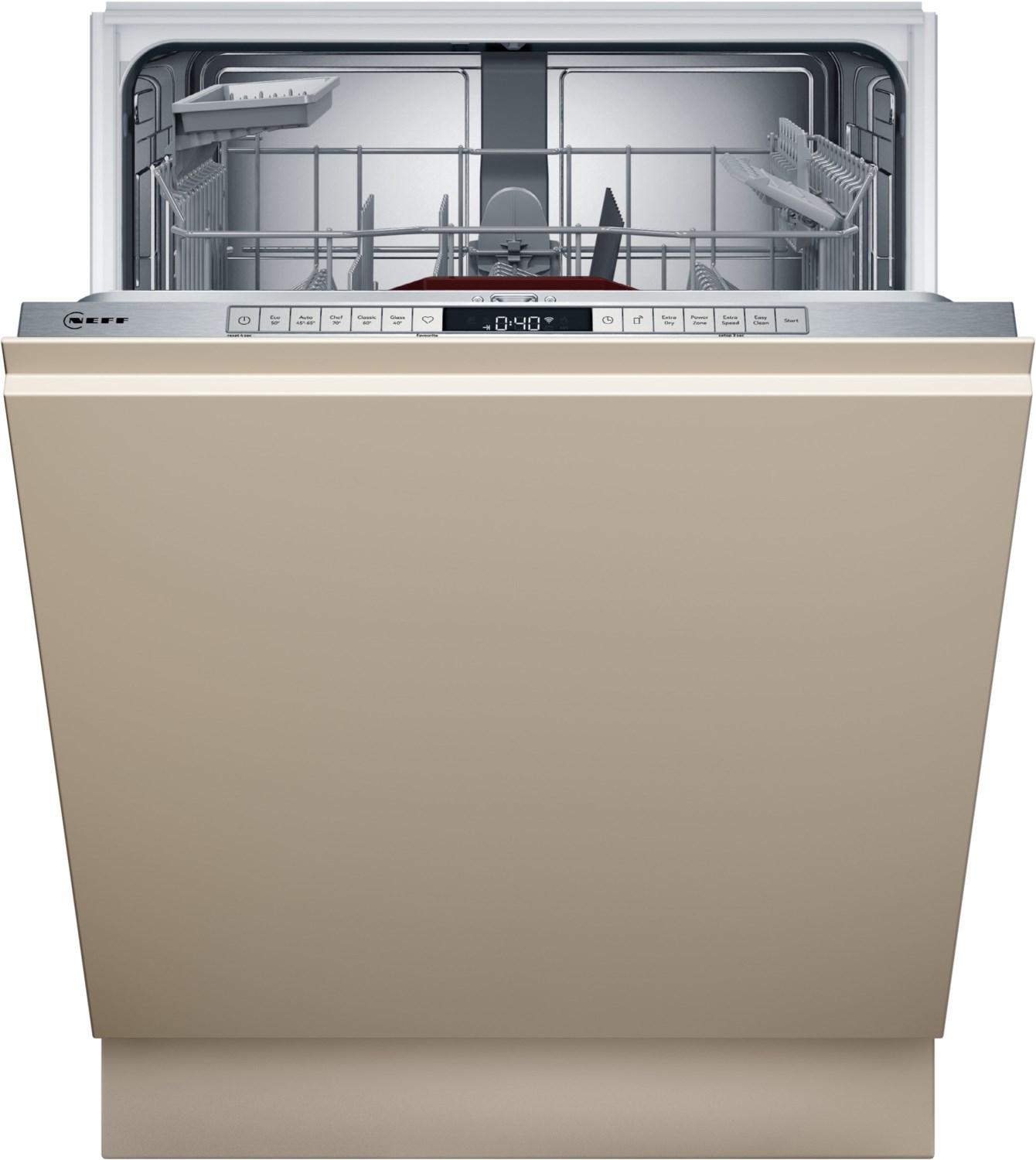 Leistung und Verbrauch Energieeffizienzklasse¹: B Energie² / Wasser³: 64 kWh / 9 Liter Fassungsvermögen: 13 Maßgedecke Programmdauer⁴: 3:35 (h:min) Geräusch: 42 dB(A) re 1 pW Geräusch-Effizienzklasse: B Programme und Optionen 6 Programme: Eco 50 °C, Auto 45-65 °C, Chef 70 °C, Classic 60 °C, Glas 40 °C, Favorit Vorspülen 4 Sonderfunktionen: Fernstart, Extra Shine, Power Zone, Extra Speed EasyClean Add-On Funktion über die Home Connect App: HygienePlus, Silence on Demand Spültechnik und Sensorik Open Dry (Eco Trocknung) mit Wärmetauscher Aquasensor Dosier Assistent EfficientSilentDrive Reiniger-Automatik Selbstreinigendes Sieb mit 3-fach Wellen-Filtersystem Innenbehälter/ Boden: Edelstahl/Edelstahl Korbsysteme Flex 1 Korbsystem Höhenverstellbarer Oberkorb mit RackMatic® (3-stufig) Komfortrollen im Unterkorb Korbstopper (Rack Stopper) gegen ein Überrollen des Unterkorbes Klappbare Tellerhaltereihen im Oberkorb (2x) Klappbare Tellerhaltereihen im Unterkorb (2x) Besteckablage im Oberkorb VarioBesteckkorb im Unterkorb Tassenablage im Oberkorb (2-teilig) Anzeige und Bedienung Bedienung von oben Bedienblende mit Klartext (englisch) Home Connect-fähig über WLAN GapLight Restzeitanzeige in Minuten Startzeitvorwahl 1-24 Stunden Akustisches Signal bei Programmende Technische Informationen und Zubehör Aqua Stop mit Varioscharnier (für Sockelhöhe >= 50 mm geeignet) Integrierter Glasschutz Salzeinfüllhilfe (Trichter) Inkl. Dampfschutz für die Arbeitsplatte Gerätemaße (H x B x T): 81.5 cm x 59.8 cm x 55.0 cm