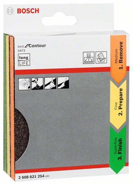 Schleifpad-Set, 3-teilig Das S473 Best für Contour lässt sich beim Handschleifen von verschiedenen Oberflächen und Konturen ganz einfach hundhaben. Er ist für eine effiziente Unterscheidung zwischen den Schleifschritten zum Entfernen, Reparieren und Endbearbeiten praktisch farbcodiert. Die Schaumstoffschicht des abrasiven Schwammes ermöglicht ein gutes Griffgefühl. Der Schwamm ist hochflexibel und passt sich perfekt an das Werkstück an, um einen effektiven Materialabtrag sicherzustellen. Das Schleifblatt S473 Best für Contour ist für Schleifarbeiten auf Holz und Farbe/Lack konzipiert. Perfekt zum Aufrauen von Holz, Kunststoff oder Metall vor dem Bemalen oder Lackieren und für Zwischenschliffe für Lacke und Farben. Ideal zum Schleifen in Falzen und leichten Kurven sowie zum Feinschleifen von Füllstoffen. Das S473 Best für Contour ist zum Handschleifen geeignet. Das S473 Best für Contour kann mehrfach gewaschen und verwendet werden. Es verfügt über starke Schwammkanten zum Kantenschleifen. An allen vier Seiten ist es zudem mit einer Körnung beschichtet, die resistent dagegen ist, Körner zu verlieren. Der Schwamm ist in 3 Farben erhältlich, die für die verschiedenen Körnungsgrößen für die verschiedenen Schleifstufen stehen. Er ist lösungsmittelfrei. Länge mm: 98, Breite mm: 120, Höhe mm: 13, Abmessungen mm: 98 x 120 x 13, Feinheitsgrad: Mittel / Fein / Superfein, Produktfarbe: Orange / Gelb / Grün - Länge: 14,5 cm, - Höhe: 4,6 cm, - Breite: 10 cm, - Gewicht: 0,05 kg