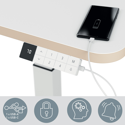 Ein starrer Arbeitsplatz belastet Ihren Körper: Der Schreibtisch Ergo von LEITZ kombiniert Flexibilität und Komfort, um eine ergonomische Arbeitshaltung zu fördern und Ihren Arbeitsalltag angenehm zu gestalten. Der LEITZ Ergo vereint durchdachte Funktionalität mit modernem Design. Die kompakte rechteckige Tischplatte aus melaminharzbeschichtetem Spanmaterial bietet eine stabile und pflegeleichte Arbeitsfläche, die sich ideal für Homeoffices oder Arbeitsplätze mit begrenztem Raum eignet. Mit einer Plattenstärke von 25 mm und den Maßen von B 800 x T 600 mm ist er platzsparend und dennoch funktional. Das weiße T-Fuß-Gestell aus pulverbeschichtetem Stahl sorgt für Standfestigkeit und Ergonomie. Der stufenlos elektrisch höhenverstellbare Bereich von 650 bis 1300 mm lässt sich dank des leisen Motors bequem anpassen. Zusätzlich erleichtert die Memory-Funktion mit vier voreingestellten Höhen den Wechsel zwischen Sitz- und Stehpositionen, wodurch Verspannungen reduziert und Ihre Gesundheit gefördert wird. Die Steh-/Sitz-Erinnerungsfunktion sorgt dafür, dass Sie regelmäßig die Haltung ändern. Das intuitiv bedienbare Display bietet eine Kindersicherung, einen Überhitzungsschutz und eine Antikollisionsfunktion, während ein USB-C- und ein USB-A-Anschluss die Stromversorgung Ihrer Geräte ermöglichen. Ein cleverer Kabelhalter und vier selbstklebende Clips verhindern Kabelsalat und halten Ihren Arbeitsplatz aufgeräumt. Optional können Sie den Ergo Pegboard Schreibtisch-Organizer integrieren, um Ihre Arbeitsmaterialien optimal zu organisieren. Mit einer maximalen Belastbarkeit von 80 kg eignet sich der Schreibtisch auch für umfangreichere Arbeitsausrüstung wie Monitore, Laptops und weiteres Zubehör. Der LEITZ Ergo Schreibtisch wurde in Deutschland gefertigt und bietet durch seine durchdachte Konstruktion sowie einfache Selbstmontage eine langlebige Lösung für ergonomisches Arbeiten in jeder Umgebung. Ausführung: * Kompakter und eleganter Sitz-/Steh-Schreibtisch * Ideal für den flexiblen Einsatz in Räumen mit eingeschränkten Platzverhältnissen, z.B. im Home-Office oder in Hybrid-Working- und Hot-Desking-Büros * Elektrisch höhenverstellbarTischplatte: * Tischform: Rechteck * Material: Spanplatte, melaminharzbeschichtet * Plattenstärke: 25 mm * Farbe: weiß * Maße: B 800 x T 600 mmTischgestell: * Form: T-Fuß * Material: Stahl * Oberfläche: pulverbeschichtet * Farbe: weiß * Stufenlos elektrisch höhenverstellbar * Verstellbereich: 650-1300 mm * 1 besonders leise laufender Motor (