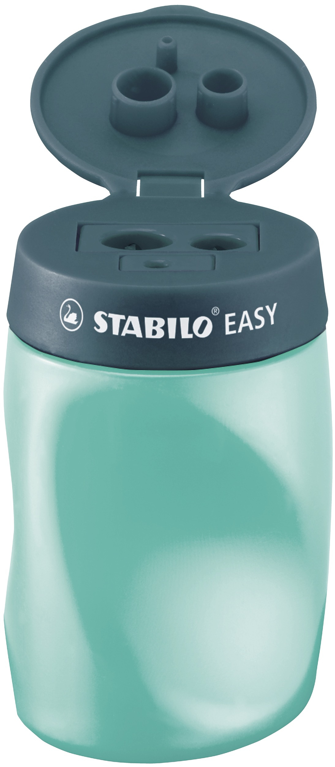 Ergonomischer Dosenspitzer STABILO EASYsharpener; Verwendung für Stiftdurchmesser: für Minen: Durchmesser 3,15 mm; für Holzstifte: Durchmesser 7,42 mm und Durchmesser 9,5 mm; Ausführung der Spitzerform: Zylinder; Material des Spitzers: Gehäuse: PS, Messer: Stahl; Spitzenform: spitz-lang und stumpf-kurz; Farbe des Spitzers: petrol; Ausführung Behälter: Runddose für Linkshänder, mit innovativen Griffmulden für eine optimale Handhabung; Mit verschließbarem Deckel und Namensschild, Dosen-Oberteil: PP, Dosen-Unterteil: PE; Füllstand sichtbar, dank transluzentem Material, petrol (transluzent), Lochverschluss vorhanden; Spitzer hat 3 verschiedene Öffnungen: Perfekt für EASYgraph, EASYcolors, EASYergo 3.15 und viele weitere dünne und dicke Holzstifte; Füllstand sichtbar, dank transluzentem Material; Sicherheitsschraube an der Spitzerklinge zum Schutz der Kinder; Größe (B x H x T): 48 x 68 x 40 mm;