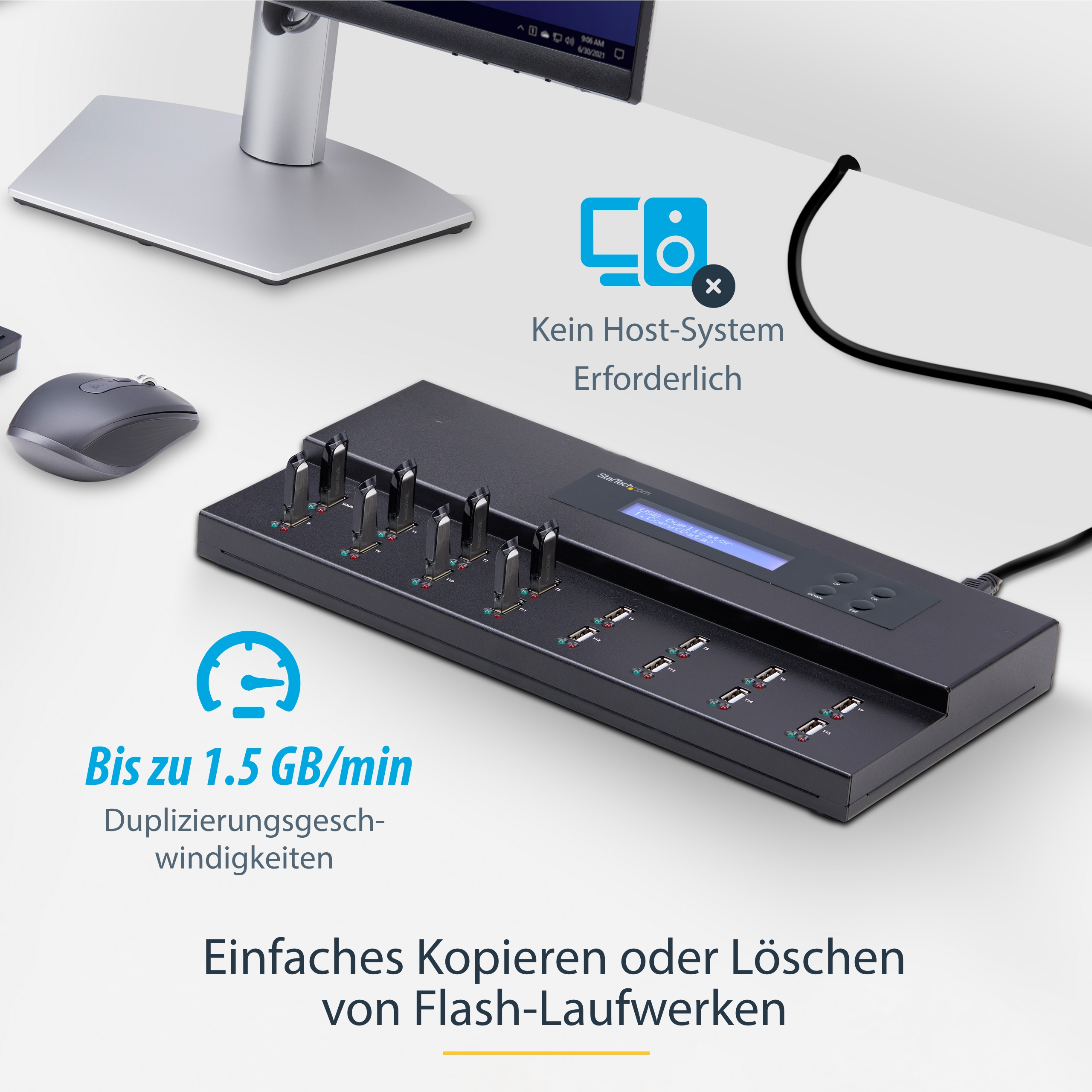 Mit diesem USB-Duplizierer und -Löscher können Sie bis zu 15 USB-Flash-Laufwerke ohne Verbindung zu einem Hostcomputer klonen oder löschen. Das bedeutet, dass Sie effizienter arbeiten und größere Mengen von USB-Laufwerken verwalten können, was Zeit und Aufwand spart. Der eigenständige USB-Duplizierer und Löscher ist ideal für IT-Profis und Systemadministratoren in Unternehmens-, Bildungs-, Marketing- oder Vertriebsumgebungen geeignet.rnrn