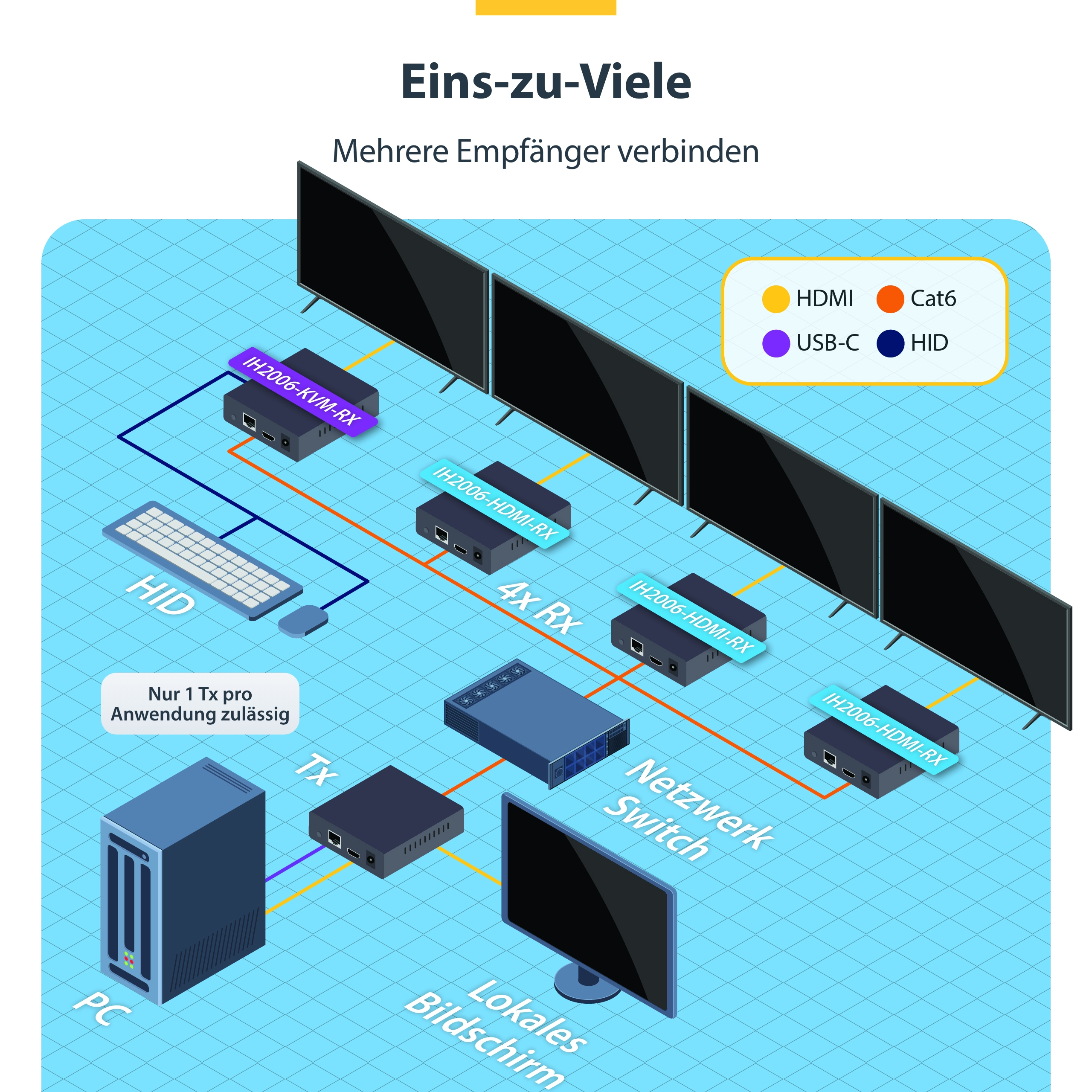 SKALIERBARES SETUP: Mit Punkt-zu-Punkt-Setup anfangen und dann mit IP-KVM-Empfängern (separat erhältlich) zu Eins-zu-Viel-Setup erweitern, um eine skalierbare, zukunftssichere Lösung zu erhalten, die mit den Bedürfnissen Ihres Unternehmens mitwächst