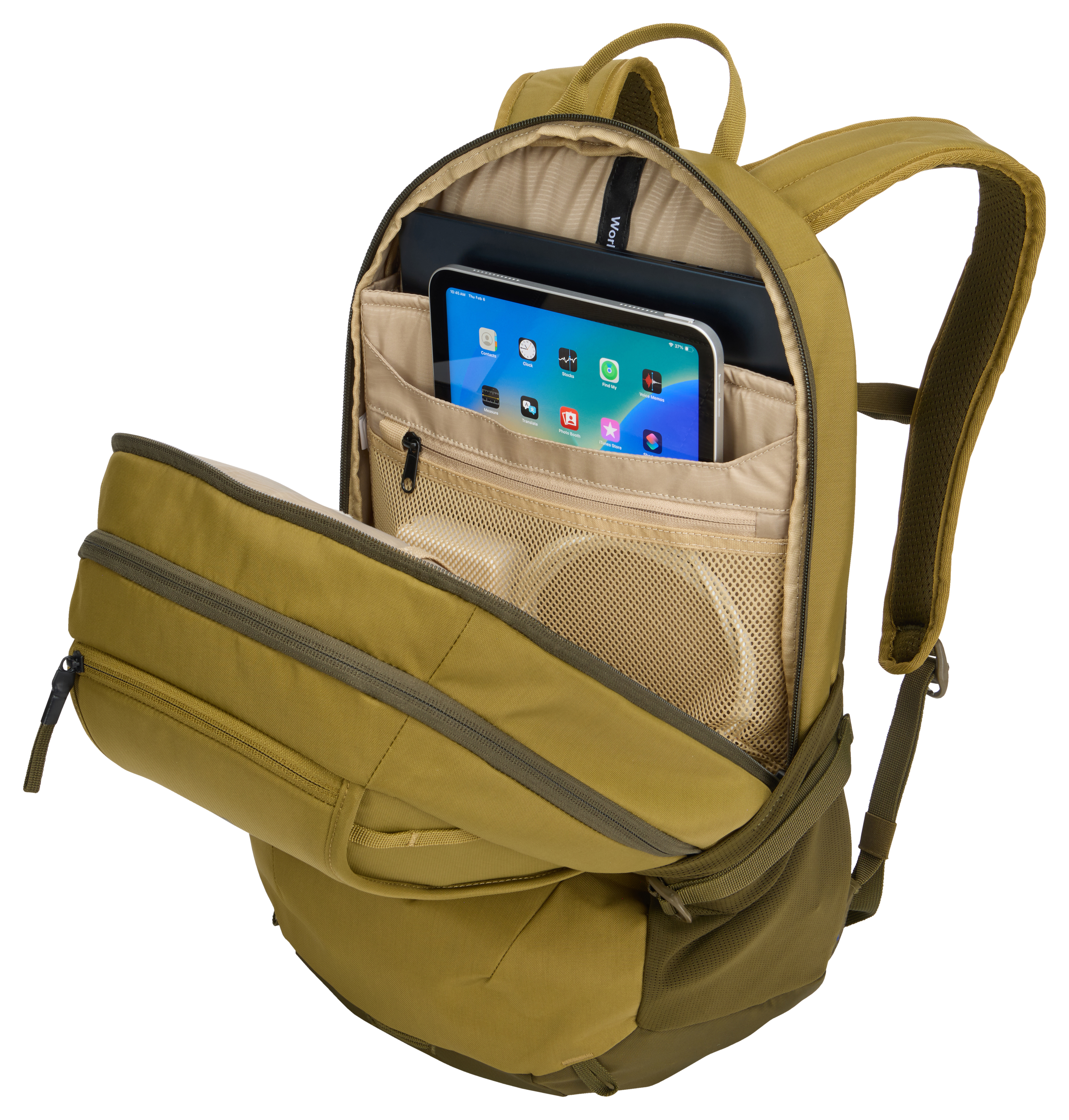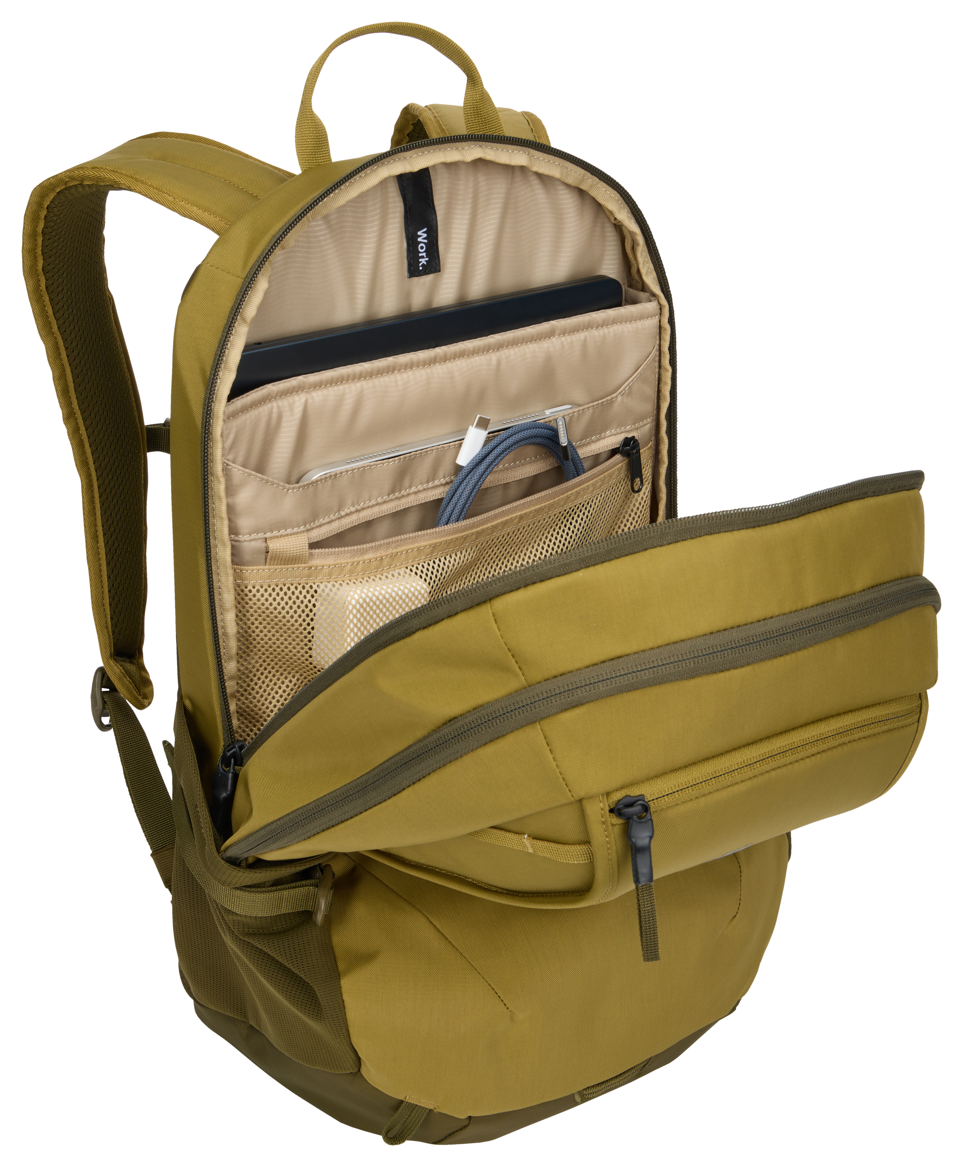 Ein vielseitiger, Outdoor-inspirierter Rucksack, der mehrere Aufbewahrungslösungen bietet, damit Sie auch unterwegs gut organisiert sind.- Abgesetzte, dedizierte Fächer schützen Laptops bis 15,6-Zoll und Tablets bis zu 10,5-Zoll- Weich gefütterte Tasche bietet schnellen Zugriff und schützt Telefon, Sonnenbrille oder andere Wertgegenstände- Die Organisationstaschen ermöglicht es Ihnen, kleine Accessoires, Stifte und Schlüssel leicht zugänglich aufzubewahren- Das sekundäre Hauptfach bietet Platz für Wechselkleidung, Accessoires oder andere persönliche Gegenstände. Es verfügt zudem über eine transparente TPU-Tasche mit Reißverschluss, die wasserfest ist, um andere Inhalte zu schützen- Seitliche Netztaschen an der Außenseite bieten Platz für eine Wasserflasche, ein Netzteil oder einen Regenschirm- Verzurrpunkte an der Vorderseite ermöglichen das einfache Anbringen zusätzlicher Ausrüstung- Mit der Trolleybefestigung können Sie den Rucksack am Trolley aufsetzen, um einfacher zu reisen- Brustgurt, gepolstertes Rückenteil mit Belüftungskanal und seitliche Kompressionsriemen zum Ausgleich der Last, was den Tragekomfort erhöht- Hergestellt aus bluesign -zertifiziertem 400D-Nylon mit YKK-Reißverschlüssen