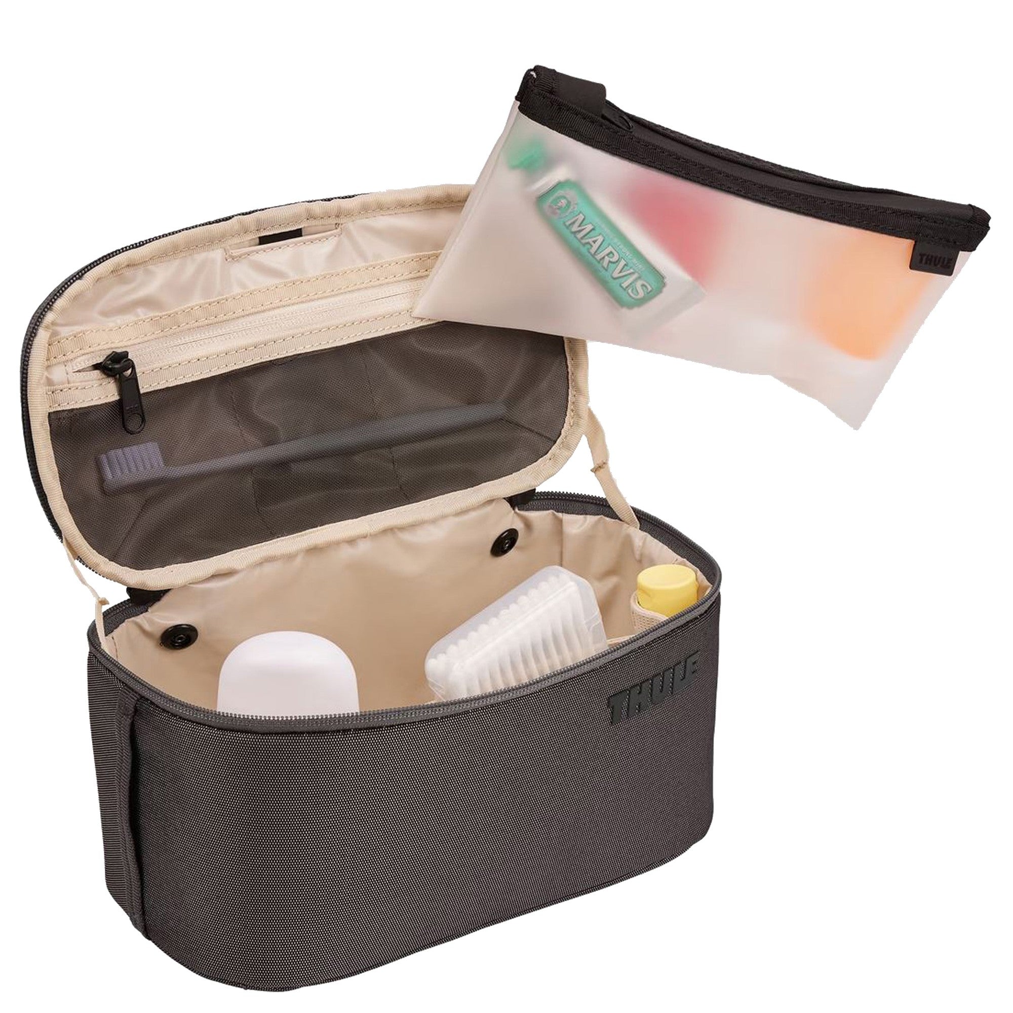 Der Thule Subterra 2 Kulturbeutel in vetiver gray ist ein funktionales Reiseaccessoire für die geordnete Aufbewahrung von Pflegeartikeln unterwegs. * Robustes Material – sorgt für Langlebigkeit und schützt den Inhalt zuverlässig * Praktische Innenaufteilung – mit einem geräumigen Hauptfach, 3 Steckfächern, 2 Reißverschlussfächern und einem zusätzlichen Fach im Deckel * Zwei-Wege-Reißverschluss – ermöglicht einfaches Öffnen und Schließen * Standfestigkeit – der Kulturbeutel bleibt stabil und gut zugänglich * Trageschlaufen an den Seiten – erleichtern den Transport * Gewicht – mit 0,25 Kilogramm besonders leicht * Volumen – bietet ausreichend Platz für alle wichtigen Hygieneartikel Ein sachlicher und funktional gestalteter Kulturbeutel, der sich ideal für Reisen und den täglichen Gebrauch eignet