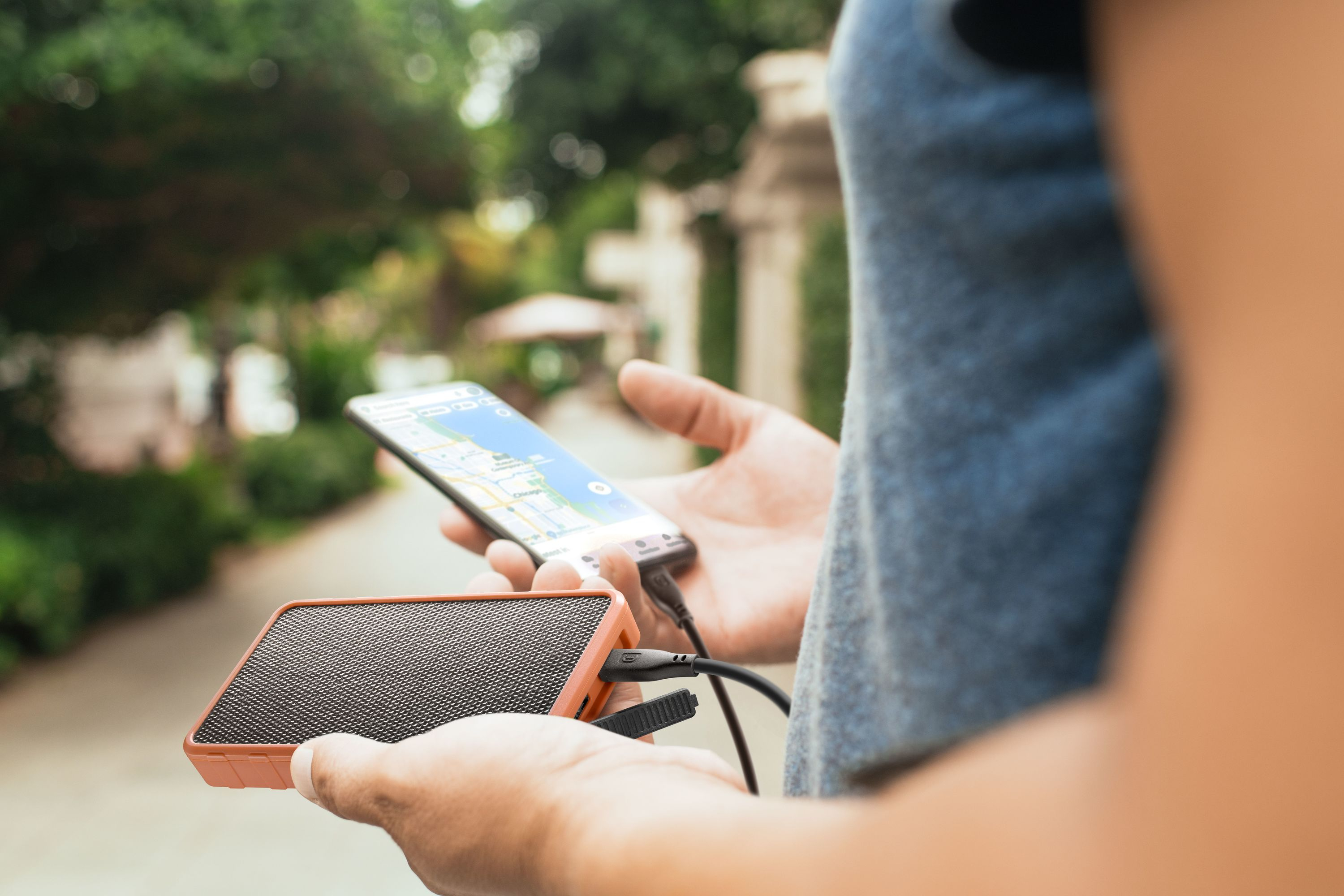 10000mAh Tragbares Ladegerät, ausgestattet mit einem ETFE-Technologie-Solarpanel, das eine um 20% schnellere Absorptionsrate von Solarenergie garantiert, hervorragende Widerstandsfähigkeit gegen Wasser, Staub und hohe Temperaturen sowie eine längere Lebensdauer. Dieses Panel ermöglicht das Aufladen des Powerbanks durch direktes Sonnenlicht sowie das Laden mit Standardkabel. Es ermöglicht das gleichzeitige Laden von zwei Geräten dank des USB-C Power Delivery 20W-Anschlusses und des USB 18W QC-Anschlusses.