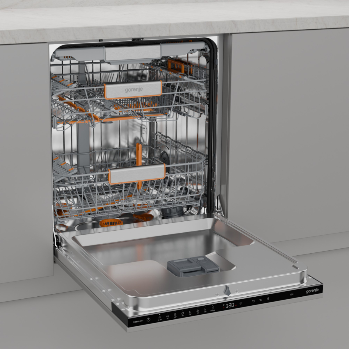 Das komfortable, zweistufige Korbverstellsystem ermöglicht es Ihnen, selbst die größten Töpfe und Teller unterzubringen. Passen Sie den Innenraum Ihres Geschirrspülers vollständig an Ihre aktuellen Bedürfnisse an.