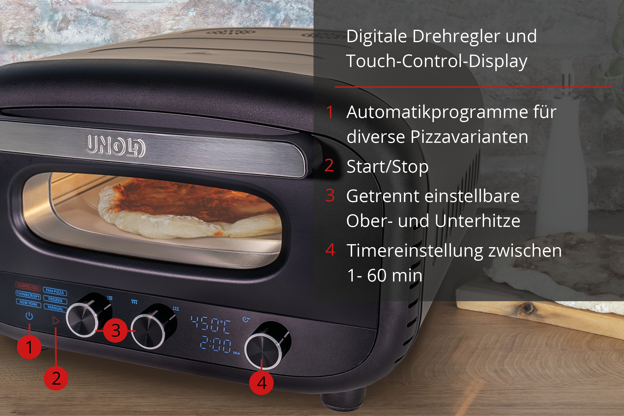Präzise Kontrolle und Vielseitigkeit: Der digitale Drehregler und das Touch-Control-Display ermöglichen eine einfache, getrennte Steuerung von Ober- und Unterhitze. Wählen Sie aus fünf automatischen Programmen für verschiedene Pizza-Stile, von Napoli bis New York-Style, sowie einem individuell einstellbaren Eigenprogramm