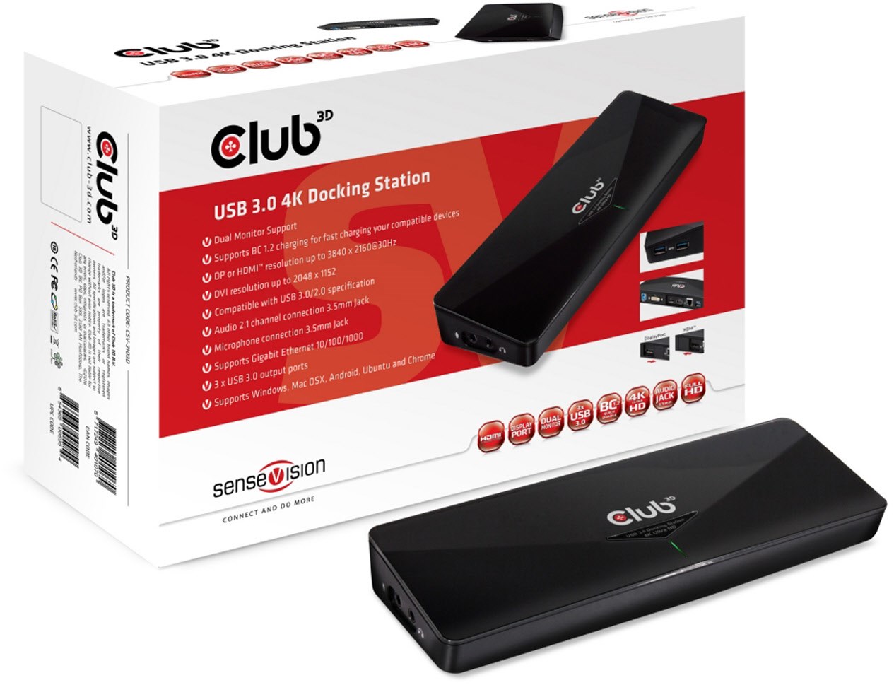 Die universelle Club 3D USB 3.0 4K Docking Station ist für all Ihre Konnektivitätsanforderungen entwickelt worden. Mit den eingebauten USB 3.0 Ports ermöglicht die Docking Station Ihnen Super Speed Datenübertragung (bis zu 5 Gbps) mit Ihren USB Peripherieprodukten zu genießen. Dabei wird auch das Kabelgewirr reduziert und der Datentransfer und die Anschlußmöglichkeiten für Ihr Notebook oder Tablet über nur einen USB 3.0 Uplink Port deutlich verbessert. Dual Monitor Unterstützung ermöglicht Ihnen zwischen DP oder HDMI Ausgang plus einem DVI Ausgang zu wählen. Bildschirmauflösungen von bis zu 4K bei 30Hz für ein Single Monitor Setup oder Full HD bei 60Hz für Dual Monitor Setups werden unterstützt. Zusätzlich werden separate Anschlüsse für Ihre Lautsprecher oder Headset und Mikrofon angeboten. Sie können sogar Ihr Smartphone über den BC1.2 Fast Charge Port in nur ein paar Minuten aufladen. BC 1.2 Aufladung Laden Sie schnell Ihre USB-fähigen Geräte. Es lädt drei Mal schneller als ein Standard-Computer USB 2.0-Anschluss.