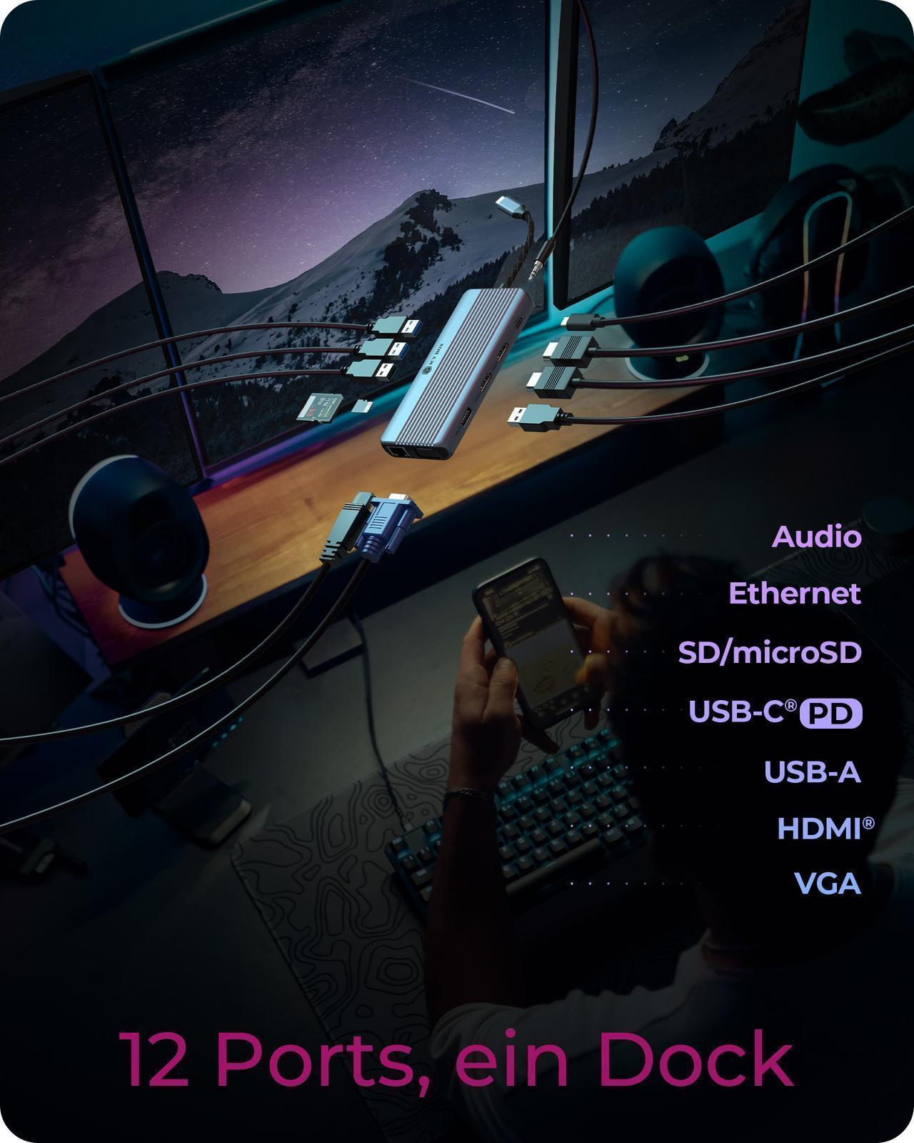 Mit 12 verschiedenen Anschlüssen vereint diese DockingStation alle deine Verbindungen in einer kompakten Lösung. Von Bildschirmen über Speicher bis hin zu Netzwerken – alles, was du brauchst, ist griffbereit.
