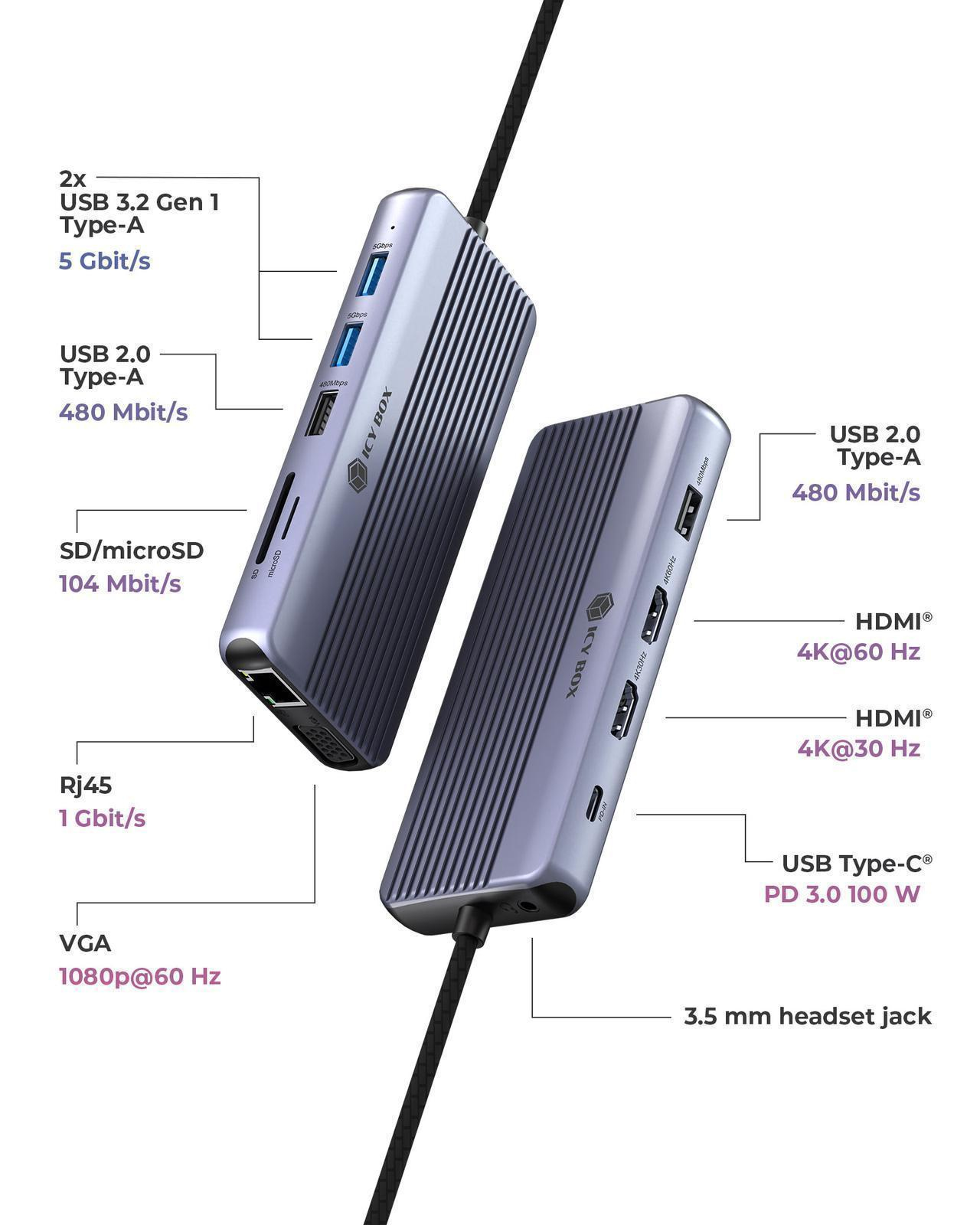USB C DockingStation 12 in 1, 2x HDMI 4K60Hz, 1x VGA, Giga LAN, 4x USB Datenports, Giga LAN, SD+MicroSD 3.0, Audio, PD 3.0 100W (IB-DK4062-CPD)