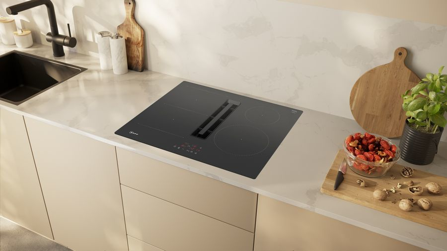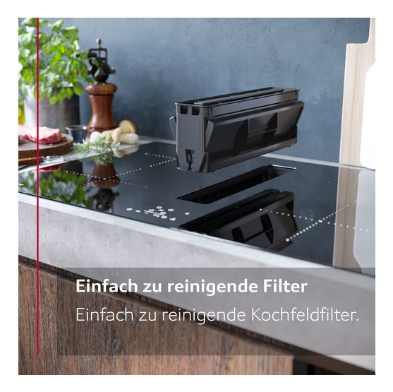 60 cm: Platz für 4 Töpfe oder Pfannen Flexibilität der Kochzonen Kombi Zone: Bei Verwendung von größerem Kochgeschirr werden zwei Kochzonen zu einer größeren verbunden. Kochzone vorne links: 190 mm, 210 mm, 2.2 kW (maximale Leistung 3.7 kW) Kochzone hinten links: 190 mm, 210 mm, 2.2 kW (maximale Leistung 3.7 kW) Kochzone hinten rechts: 145 mm, 1.4 kW (maximale Leistung 2.2 kW) Kochzone vorne rechts: 210 mm, 2.2 kW (maximale Leistung 3.7 kW) Benutzerfreundlichkeit TouchControl: Steuerung der Leistung mit den aufgedruckten +/- Touch-Tasten. 17 Leistungsstufen: Stellen Sie die Hitze mit 17 Leistungsstufen (9 Hauptstufen und 8 Zwischenstufen) präzise ein. Abschalttimer: schaltet die Kochzone am Ende der eingestellten Zeit aus (z. B. für gekochte Eier). Countdown-Timer: Ein Signal ertönt am Ende der eingestellten Zeit (z. B. beim Pastakochen). Zeitersparnis und Effizienz Powerstufe für Töpfe: Mit 50 % mehr Leistung z. B. Wasser schneller zum Kochen bringen als auf höchster Leistungsstufe. Quick Start Funktion: Beim Einschalten wählt das Kochfeld automatisch die Kochzone aus, auf dem im ausgeschaltetem Zustand Kochgeschirr aufgesetzt wurde. Restart Funktion: Im Falle von unbeabsichtigtem Ausschalten des Kochfeldes bleiben alle Einstellungen erhalten, wenn Sie innerhalb von 4 Sekunden wieder einschalten. Schnelles Abschalten: Schnelles Abschalten durch längeres Berühren der Bedienfläche der Kochzone. Design Rahmenlos Sicherheit 2-stufige Restwärmeanzeige je Kochzone: Zeigt an, welche Kochzonen noch heiß oder warm sind. Kindersicherung: Verhindert eine unbeabsichtigte Aktivierung des Kochfeldes. Hauptschalter: Alle Kochzonen auf einmal ausschalten. Automatische Sicherheitsabschaltung: Aus Sicherheitsgründen schaltet das Kochfeld nach einer voreingestellten Zeit ohne Interaktion automatisch ab. Installation Maße des Gerätes (HxBxT mm): 223 x 592 x 522 Erforderliche Nischengröße (HxBxT mm): 223 x 560 x (490 - 490) Minimale Arbeitsplattenstärke: 16 mm Gesamtanschlusswert: 7400 W Powermanagement Funktion: Bei Bedarf die maximale Leistung begrenzen (abhängig von der Absicherung der Elektroinstallation). Zubehör Clean Air Plus Geruchsfilter, Teleskopschieberelement für Umluft beigelegt Integriertes Downdraft- Lüftungssystem Induktionskochfeld mit vollintegriertem, leistungsstarkem Downdraft- Abzugsmodul. Geeignet für Umluft- oder Abluftbetrieb (inkl. differenzierter Softwaremodi). Installationszubehör für ungeführte Umluft, darunter vier cleanAir Plus-Geruchsfilter und ein Teleskop- Schiebeelement, sind im Lieferumfang des Kochfeldes enthalten. Zubehör für andere Einbaumöglichkeiten ist erhältlich, Details in den Planungshinweisen. Ästhetisch integriertes, flächenbündiges Lufteinlassdesign mit schwebendem, hitzebeständigem Glaskeramikelement für freie Bewegung und Platzierung des Kochgeschirrs. Lüftungssystem mit 3 elektronisch gesteuerten Lüfterstufen und einer Intensivstufe (mit automatischer Rückstellung). Steuerung per TouchControl. Automatisches Einschalten des Lüftungssystem bei Nutzung einer Kochzone. Automatische verzögerte Abschaltung nach dem Kochen, um Restgerüche nach dem Kochen zu beseitigen (in spezifischer ultra- geräuscharmer Ventilatorstufe, 12min (Abluft), 30min (Umluft), manuell abschaltbar) Vollständig manuelle Steuerung über TouchControl möglich. Gebläsetechnologie mit hocheffizientem und geräuscharmen EcoSilence Drive Motor. Strömungstechnisch optimierte Luftführung im Innenraum Einfaches Entnehmen und Reinigen der Fettfilter- und Überlaufschutzeinheit. Bequeme Ein-Hand-Entnahme der Filter-Einheit. Großflächige, 12- lagige Edelstahl-Fettfilter für hohe Fettfiltrationseffizienz (94 %). Alle Teile sind einfach zu reinigen, spülmaschinengeeignet und hitzeresistent. Kondensat- und Überlaufschutzbehälter, ca. 200 ml Aufnahmekapazität. - Kondensat- und Überlaufschutzbehälter, ca. 200 ml Aufnahmekapazität Sicherheitsüberlauftank (spülmaschinengeeignet) mit zusätzlichen 700 ml Aufnahmekapazität. Einfach zugänglich und von unten abnehmbar. Insgesamt eine Aufnahmekapazität von 900 ml (200 ml + 700 ml) Wasserdichtes Lüftungssystem Dunstabzug Leistung: Abluftleistung (nach EN 61591): min. Normalstufe 330 m3/h , max. Normalstufe 500 m3/h , max. Boost-/Intensivstufe 622 m3/h Umluftleistung (nach EN 61591): min. Normalstufe 252 m3/h , max. Normalstufe 441 m3/h , max. Boost-/Intensivstufe 595 m3/h Geräuschwerte bei Abluftbetr