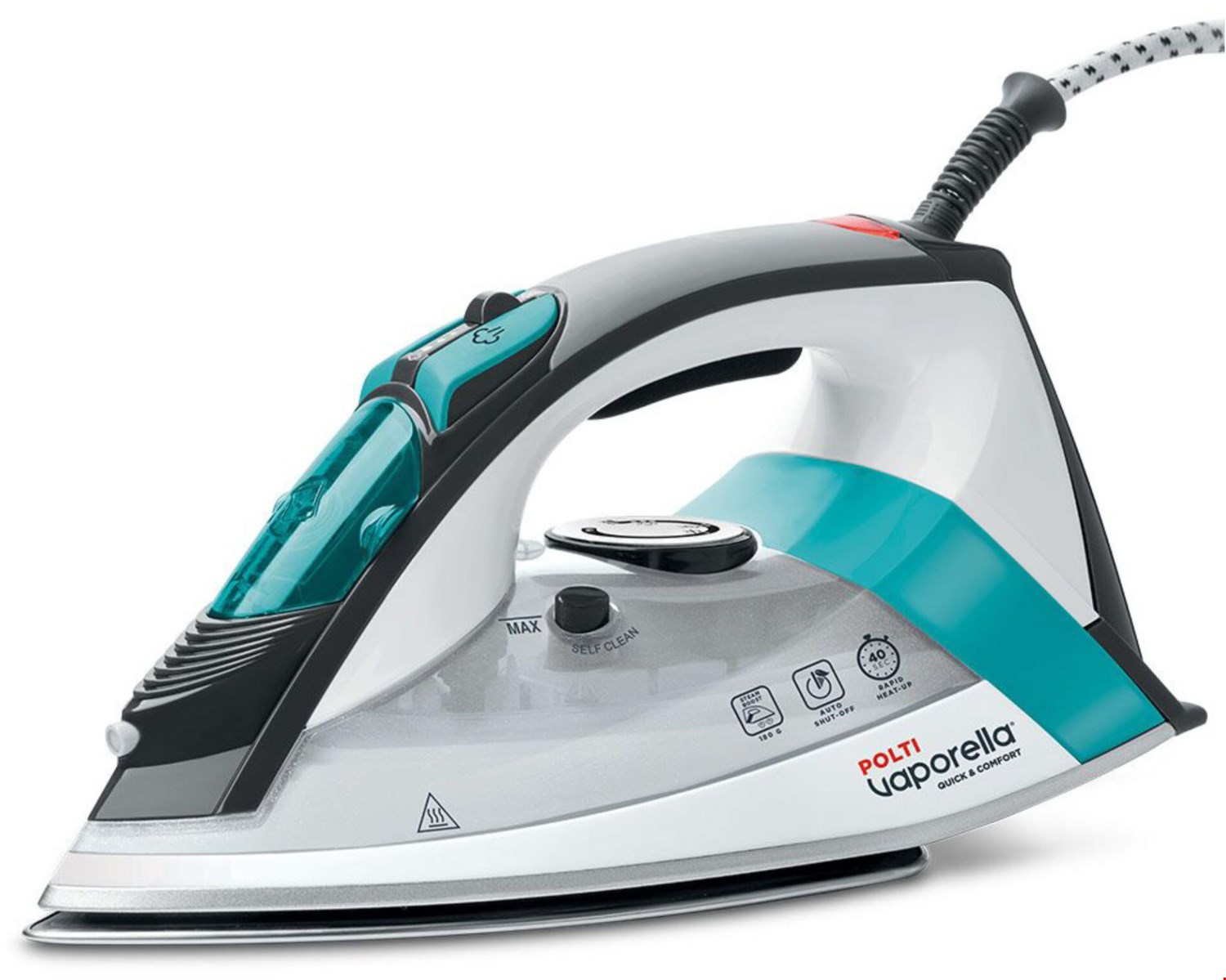 Seide, Baumwolle, Leinen? Mit Polti Vaporella Quick & Comfort kannst du durch die Einstellung von Temperatur und Dampf alle Arten von Stoffen bügeln. Exzellenter Griff und Komfort bei der Benutzung Das weiche Polster am Griff des Bügeleisens sorgt für maximalen Komfort beim Bügeln. Gleichmäßige Wärme und Haltbarkeit Polti Vaporella Quick & Comfort hat eine Edelstahlsohle mit konzentrierten Löchern an der Spitze und den Seiten. Wenn Sie abgelenkt werden, schaltet sich Polti Vaporella aus Die Auto-Off-Funktion wird automatisch aktiviert, wenn das Bügeleisen nicht benutzt wird. Wenn Sie den Stoff wechseln, ändern Sie die Temperatur Sie können sowohl die Temperatur der Bügelsohle als auch die Dampfmenge über die Einstellungen am Bügeleisen regulieren. Kraftvoller 180-g-Dampfschuss Mit dem Dampfstoß von 180 g können Sie effektiver bügeln und selbst die komplexesten Falten beseitigen. Einfach und sofort einsatzbereit Das Bügeleisen wird mit Leitungswasser bereit gemacht und ist nach dem Anschluss an das Stromnetz in Sekundenschnelle einsatzbereit. Sofort startklar Das Bügeleisen wird mit Leitungswasser bereit gemacht und ist nach dem Anschluss an das Stromnetz in Sekundenschnelle einsatzbereit. Bügelt selbst die Details Für alle, die Details lieben: Mit Polti Vaporella Quick & Comfort lassen sich selbst die Details bügeln - für einen perfekten Look.