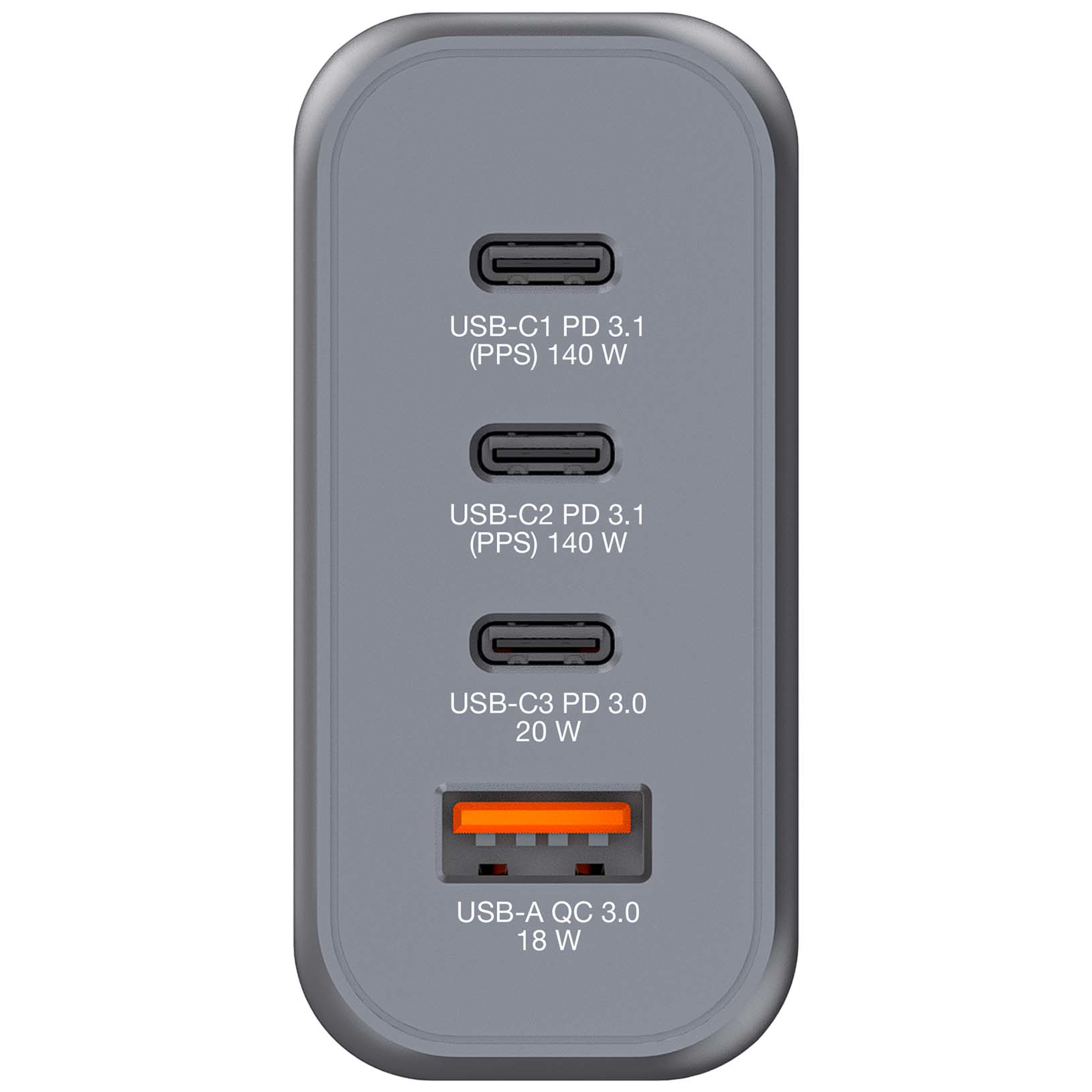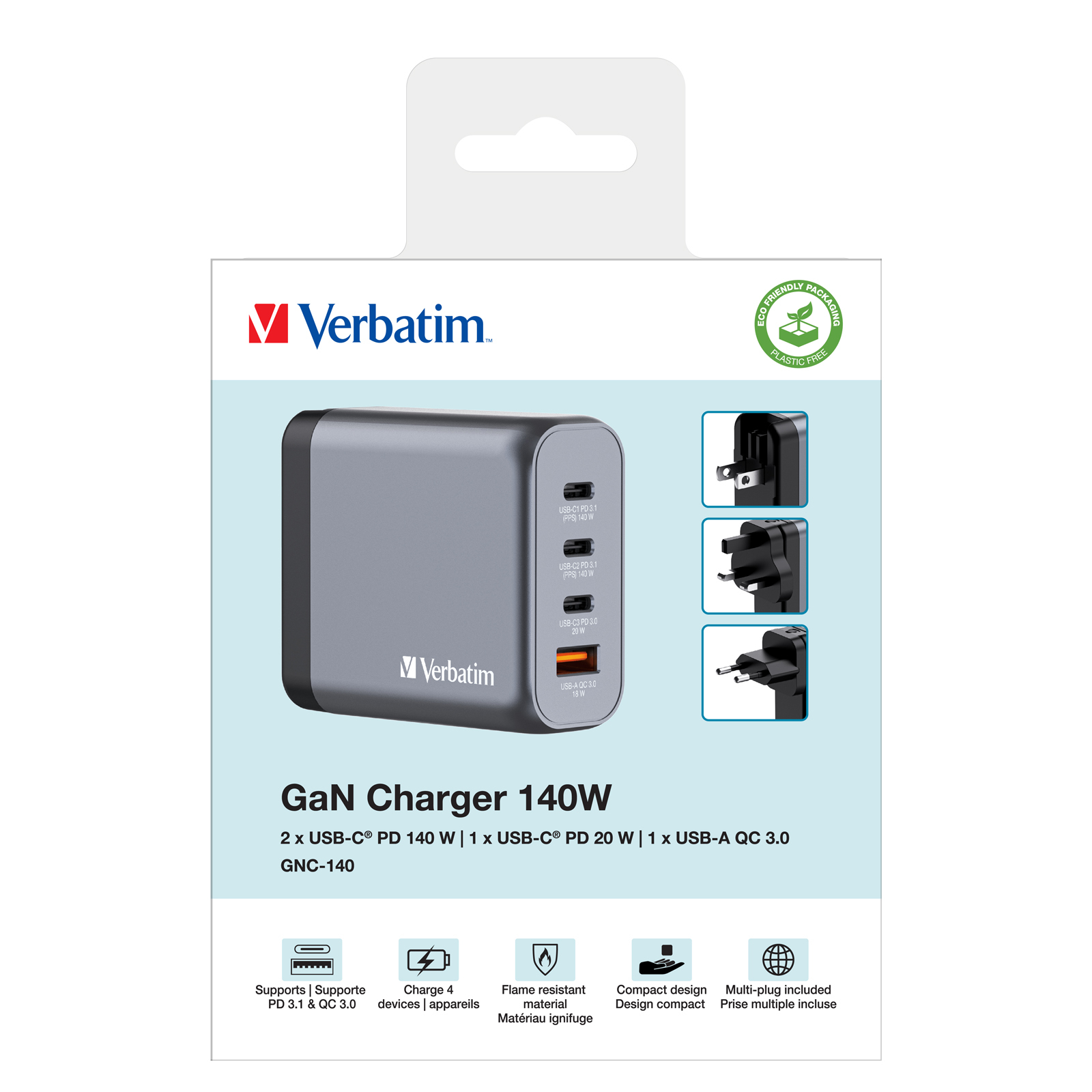 Verbatim's 140W ladegerät kombiniert zwei Usb-C PD 140W Anschlüsse, einen Usb-C PD 20W Anschluss und einen Usb-A 18W QC 3.0 Anschluss in einem schlanken, handflächengroßen Design. Ideal für das Büro, Zuhause oder auf Reisen, um Ihren Laptop, Tablet, Smartphone, Gaming-Geräte und mehr mit Strom zu versorgen. Mit seinen klappbaren US-Steckern und austauschbaren EU- und UK-Steckern ist es der ultimative Reisebegleiter. Gallium-Nitrid (GaN)-Technologie ermöglicht leistungsstarkes, schnelles und effizientes Laden, erzeugt weniger Wärme und ermöglicht kleinere und leichtere Ladegeräte, die ultra-portabel und ideal für Reisen sind. Das Gnc-140 Ladegerät besteht aus hochwertigen, flammhemmenden Materialien und verfügt über vier Sicherheitsschutzsysteme, um Ihre Sicherheit beim Laden zu gewährleisten. Features: 140W USB-Ladegerät mit 4 Anschlüssen für schnelles und effizientes Laden Kompaktes Design mit klappbaren Steckern für einfaches Reisen GaN-Technologie für geringere Wärmeentwicklung und leichtere Ladegeräte Hochwertige Materialien und 4 Sicherheitsschutzsysteme für sicheres Laden Kompatibel mit Laptops, Smartphones, Tablets und mehr Technische Daten: Betriebsspannung: 100…240 V~ Leistungsaufnahme: 50/60Hz, 2,1 A (Max) Gesamtleistung: 140 W Single-Port-Ausgang: Usb-C1 PD 3.1: 3.3-21V⎓5A, 5V⎓3A, 9V⎓3A, 12V⎓3A, 15V⎓3A, 20V⎓5A, 28V⎓5A (140W Max) / Usb-C2 PD 3.1: 3.3-21V⎓5A, 5V⎓3A, 9V⎓3A, 12V⎓3A, 15V⎓3A, 20V⎓5A, 28V⎓5A (140W Max) / Usb-C3 PD 3.0: 5V⎓3A, 9V⎓2.22A, 12V⎓1.67A (20W Max) / Usb-A QC 3.0: 5V⎓3A, 9V⎓2A, 12V⎓1.5A (18W Max) Unterstützte Geräte: Laptop, iPhone, iPad, Smartphones, Tablet PCs, Mp3/Mp4 Players, Smartwatch, etc. Eingabesteckerformate: US (Typ A) / EU (Typ C) / UK (Typ G) Material: PC feuerfest Gewicht: 270 g Maße (LxBxH): 76,5x31,3x67,7 mm Lieferumfang: 1x USB-Ladegerät 1x EU-Adapter 1x UK-Adapter 1x Bedienungsanleitung