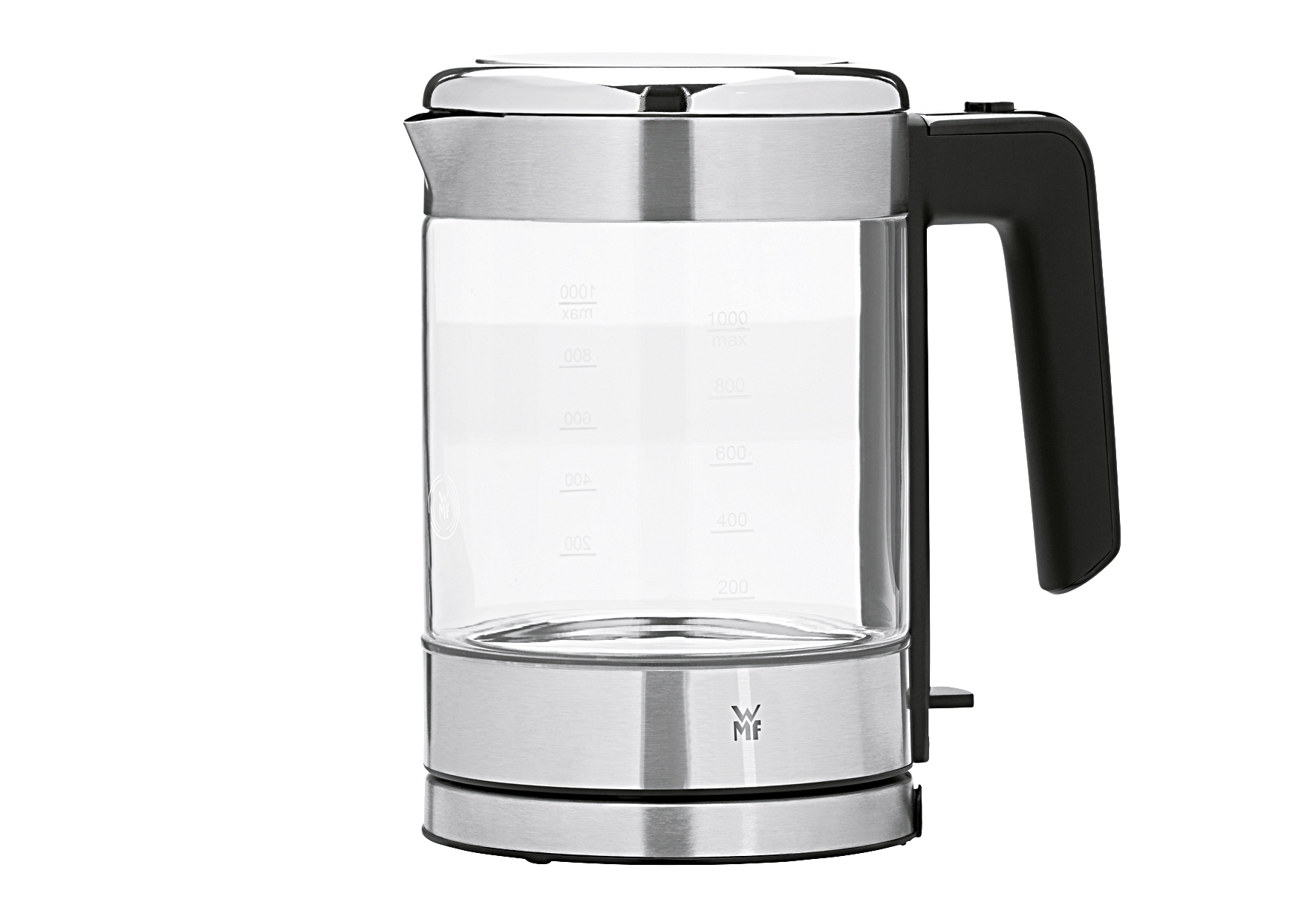 Gehäuse aus hochwertigem Cromargan matt, Fassungsvermögen: 1 l, Wasserkocher mit separatem Gerätesockel inkl. Kabelaufwicklung, außenliegende Wasserstandsanzeige, herausnehmbarer, abwaschbarer Kalkwasser-Filter, Einhanddeckelöffnung per Knopfdruck, hohe Sicherheit durch Trockenlauf- und Überhitzungsschutz, Kochstoppautomatik und Deckelverriegelung, Leistung: 1.900 Watt max., Schukostecker CEE 7/7