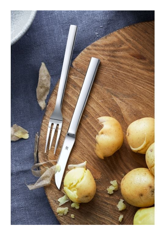 Für alle Fälle gut gerüstet: mit Nuova Spezialbesteck von WMF. Ob als Beilage, oder als Grundlage für herzhafte Bratkartoffeln oder Kartoffelklöße, spielen Pellkartoffeln in der Küche eine wichtige Rolle. Das Nuova Pellkartoffel-Set besteht aus einer Gabel mit drei Zinken, die im Dreieck angeordnet, die heiße Kartoffel sicher festhalten, ohne sie zu beschädigen. Mit dem Schälmesser wird die Kartoffel dann gepellt - und die Finger bleiben verschont. Das 2-teilige Nuova Pellkartoffel-Set wird in einer hochwertigen, illustrierten Faltschachtel geliefert, die auch als Geschenkverpackung eine gute Figur macht. Die Besteck-Kollektion Nuova von WMF umfasst nahezu 50 Spezialbesteckteile - von der Pastazange bis zum Honiglöffel, vom Fischbesteck bis zu zum Käsemesser. Zeitlos-schlicht designed, harmoniert Nuova nicht nur mit jedem Ambiente, sondern auch mit jedem anderen Besteck. Dabei liegen alle Besteckteile einfach perfekt in der Hand und überzeugen mit höchster Funktionalität im Alltag. Gefertigt aus hochwertigem Cromargan®: Edelstahl Rostfrei 18/10 ist Nuova selbstverständlich pflegeleicht spülmaschinenfest, völlig geschmacksneutral, sehr strapazierfähig und resistent gegen Speisesäuren.