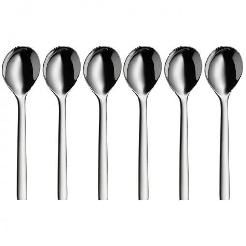 Für alle Fälle gut gerüstet: mit Nuova Spezialbesteck von WMF. Klassische Suppentassen erfreuen sich immer größerer Beliebtheit in vielen Haushalten. Natürlich lässt sich die Suppe auch mit einem üblichen Menuelöffel geniessen, der Nuova Suppentassellöffel ist aber die bessere Alternative, denn seine Form und Länge sind speziell auf bauchige Suppentassen ausgerichtet. Das 6-teilige Nuova Suppentassenlöffel-Set für 6 Personen wird in einer hochwertigen, illustrierten Faltschachtel geliefert, die auch als Geschenkverpackung eine gute Figur macht. Die Besteck-Kollektion Nuova von WMF umfasst nahezu 50 Spezialbesteckteile - von der Pastazange bis zum Honiglöffel, vom Fischbesteck bis zu zum Käsemesser. Zeitlos-schlicht designed, harmoniert Nuova nicht nur mit jedem Ambiente, sondern auch mit jedem anderen Besteck. Dabei liegen alle Besteckteile einfach perfekt in der Hand und überzeugen mit höchster Funktionalität im Alltag. Gefertigt aus hochwertigem Cromargan®: Edelstahl Rostfrei 18/10 ist Nuova selbstverständlich pflegeleicht spülmaschinenfest, völlig geschmacksneutral, sehr strapazierfähig und resistent gegen Speisesäuren.