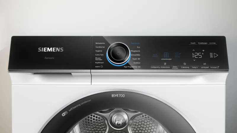 Trockner WQ46B2D41 von Siemens Der Wärmepumpentrockner WQ46B2D41 ist von Siemens. Mit einer Betriebslautstärke von 56 dB arbeitet der Siemens WQ46B2D41 außerordentlich leise. Machen Sie Ihr Zuhause smart, indem Sie den Wärmepumpentrockner via WLAN über das Smartphone oder Tablet bedienen und . Funktionen und Programme Die Kurz-/Zeitspar-Taste verschafft Zeitersparnis. Der Nutzen des Hygiene-Programms liegt auf der Hand: Krankheitserreger werden zuverlässig beseitigt. Mit dem Fein-Programm und dem Schon-Programm kann empfindliche Kleidung schonend behandelt werden. Da unterschiedliche Textilien auch eine unterschiedliche Behandlung brauchen, gibt es jeweils Programme für Baumwolle, Mischwäsche, Bettwäsche, Pflegeleichtes, Dessous, Blusen und Hemden, Outdoor- und Sportbekleidung, Wolle sowie Handtücher. Zu den Einstellungen des Siemens WQ46B2D41 zählt auch das Extra-Trocken-Programm. Immer wieder ermittelt der Feuchtigkeitssensor, wie viel Wasser sich noch in der Wäsche befindet, so wird diese nicht länger als nötig getrocknet. Flusen nach Ende des Programms zu entfernen ist dank automatischer Flusenentfernung im Kondensator nicht erforderlich. Dadurch zeichnet sich der Wäschetrockner außerdem aus Ob rechts oder links: Mit einem wechselbaren Tür-Anschlag entscheiden Sie, je nachdem, was praktischer ist. Die Kindersicherung bietet ein Plus an Sicherheit. Die Restzeitanzeige verrät Ihnen, wann die Wäsche fertig ist. Das Modell trägt die Energieeffizienzklasse B und ist mit der Kondensationseffizienzklasse B ausgezeichnet. Unsere Kaufempfehlung Was Sie suchen, ist ein Wärmepumpentrockner, der über eine Kindersicherung verfügt, über das Smartphone bedient werden kann und sich selbst reinigt? Mit dem Siemens WQ46B2D41 machen Sie alles richtig.