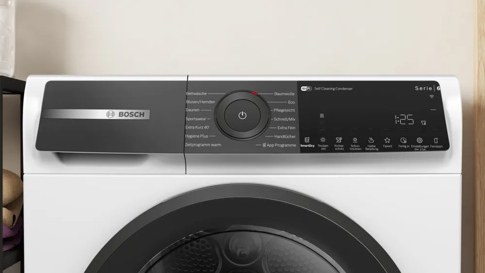 Bosch-Trockner WQH245B40 Das Modell WQH245B40 ist ein Wärmepumpentrockner von Bosch. Außerordentlich leise arbeitet der Bosch WQH245B40 mit einem Betriebsgeräusch von 61 dB. Die Möglichkeit, den Wärmepumpentrockner via WLAN über das Smartphone oder Tablet zu bedienen und , macht das Modell besonders smart. Funktionen und Programme Das Kurz-Programm verschafft Zeitersparnis. Keime werden mit dem Hygiene-Programm zuverlässig bekämpft. Mit dem Fein-Programm, dem Schon-Programm und der Schon-Taste für niedrigere Temperaturen kann empfindliche Kleidung schonend behandelt werden. Da unterschiedliche Textilien auch eine unterschiedliche Behandlung benötigen, gibt es jeweils Programme für große Wäschestücke, Handtücher, Wolle, Pflegeleichtes, Blusen und Hemden, Outdoor- und Sportbekleidung, Baumwolle sowie Bettwäsche. ist ebenso eine Option des Bosch WQH245B40. Punktgenaues Trocknen erlaubt der Feuchtigkeitssensor, der immer wieder misst, wie viel Wasser noch in der Wäsche ist. Es ist dank automatischer Flusenentfernung im Kondensator nicht erforderlich, nach Programmende das Sieb zu reinigen. Dadurch zeichnet sich der Wärmepumpentrockner außerdem aus Der Tür-Anschlag befindet sich rechts. Die Kindersicherung bietet ein Plus an Sicherheit. Im Hinblick auf die Effizienz ist die Energieeffizienzklasse C zu nennen. Unsere Kaufempfehlung Wie geschaffen ist der Bosch WQH245B40 für alle, die sich einen Trockner mit Kindersicherung, Internetfunktion und Selbstreinigung wünschen.
