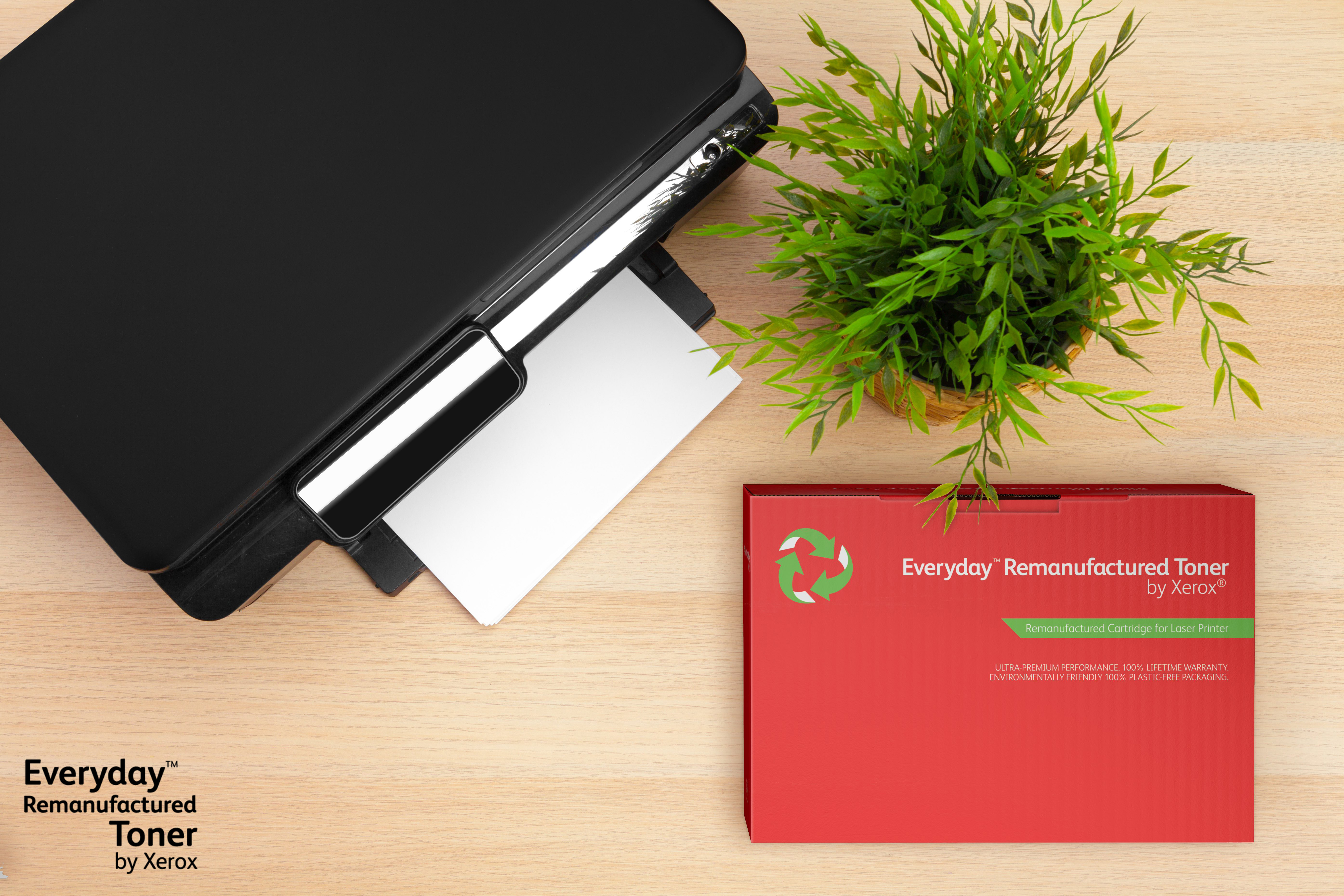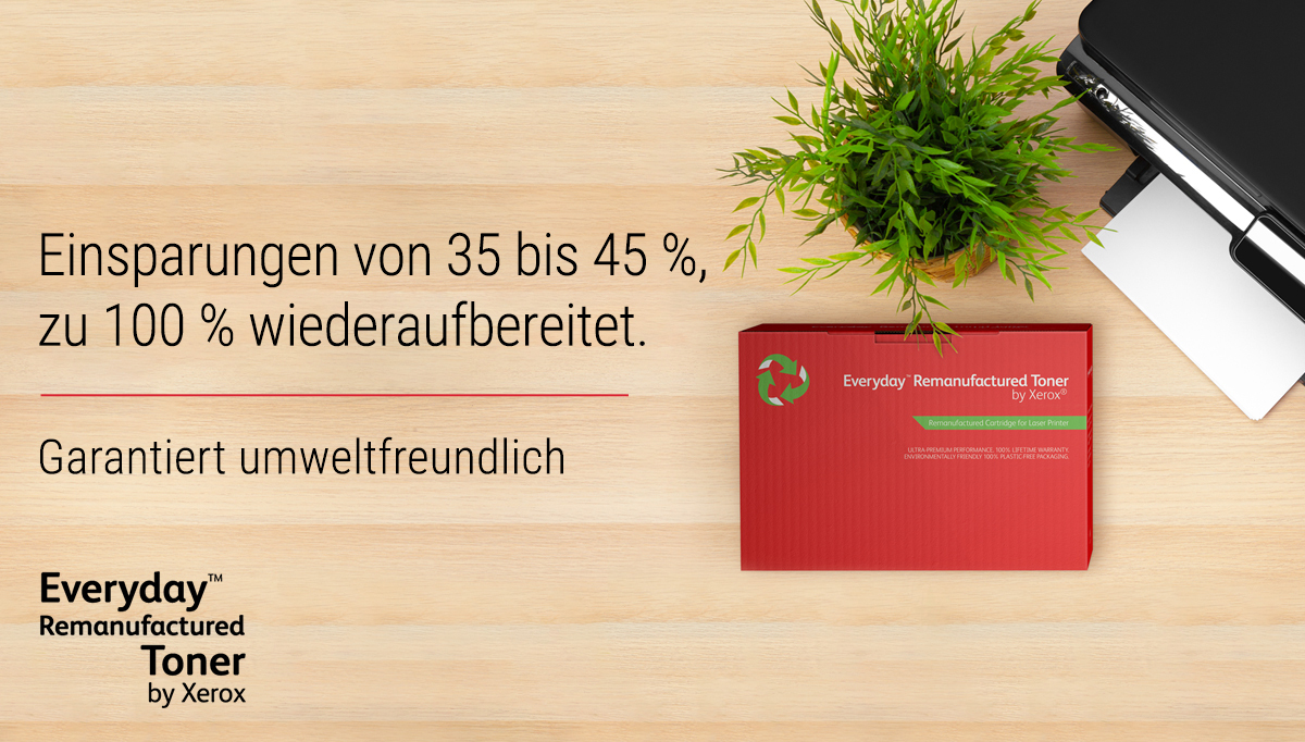 • UNÜBERTREFFLICHE NACHHALTIGKEIT: Der Everyday wiederaufbereitete Toner von Xerox wird mit geringeren natürlichen Ressourcen hergestellt und hat dazu eine geringere CO2-Bilanz.